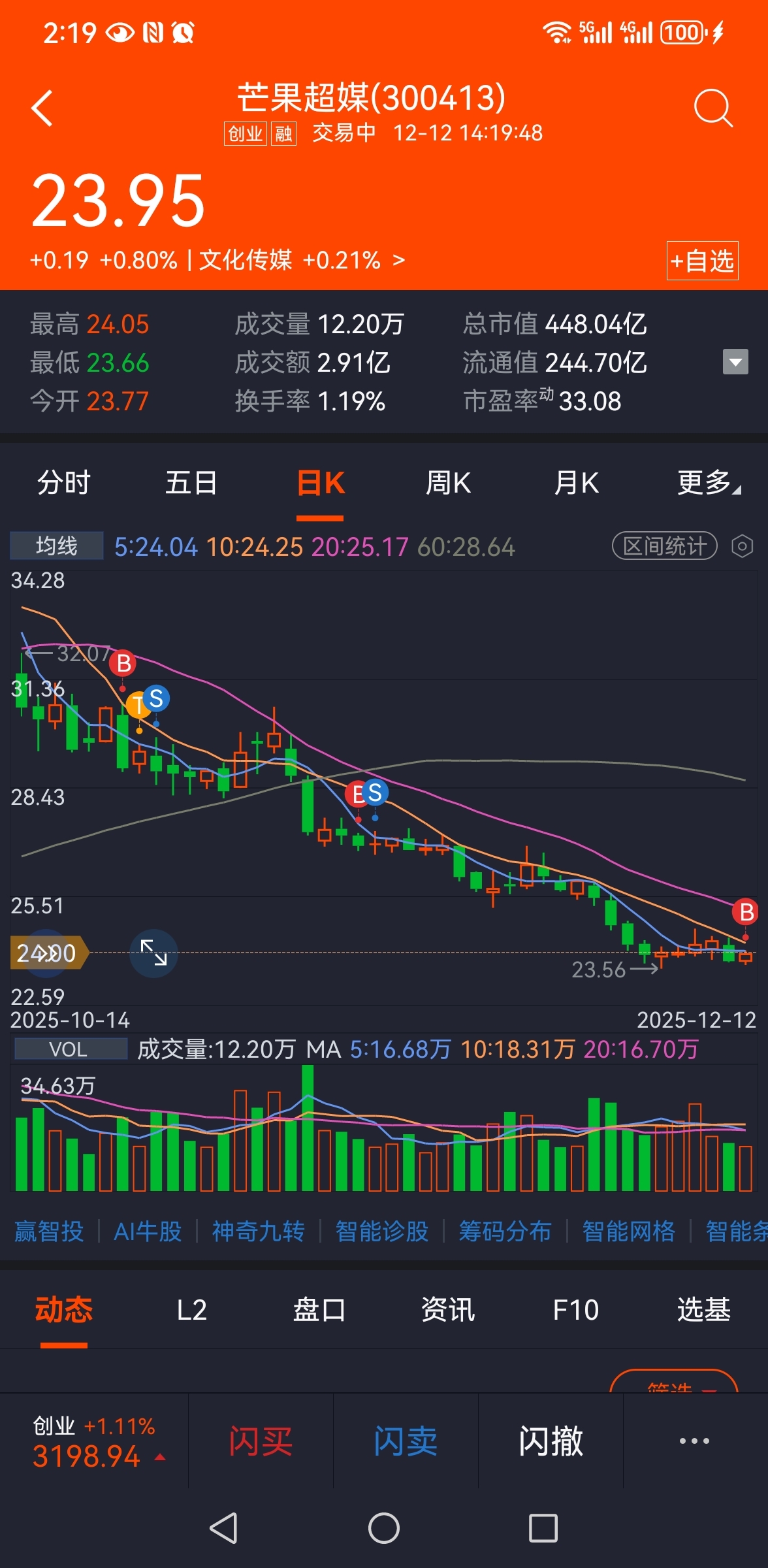 $芒果超媒(SZ300413)$ 买了,下跌途中第三次套利,止损位23.56,盈亏比看着挺高的