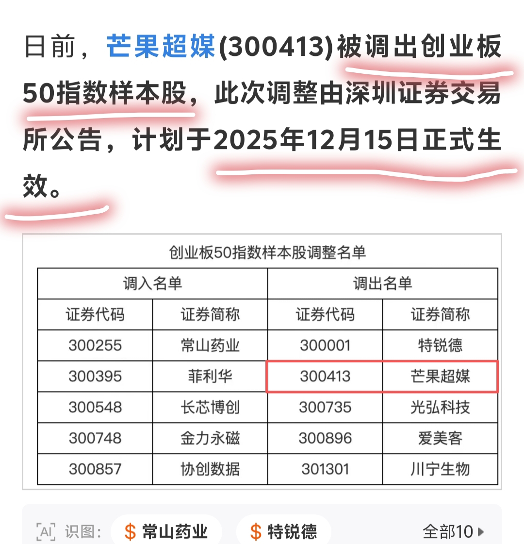 $芒果超媒(SZ300413)$ 今天开始被调出创业板50指数样本股。然后开盘就跌了3个点,这还不跑?