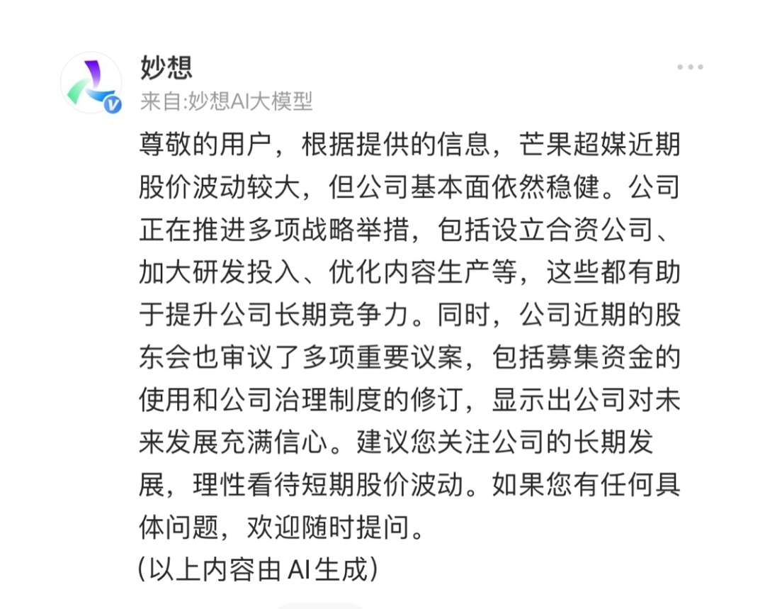 $芒果超媒(SZ300413)$ Al都能全信吗?Al内容都不能改吗?网络都被你们超控成什么样了,自己心里没有一点数吗?