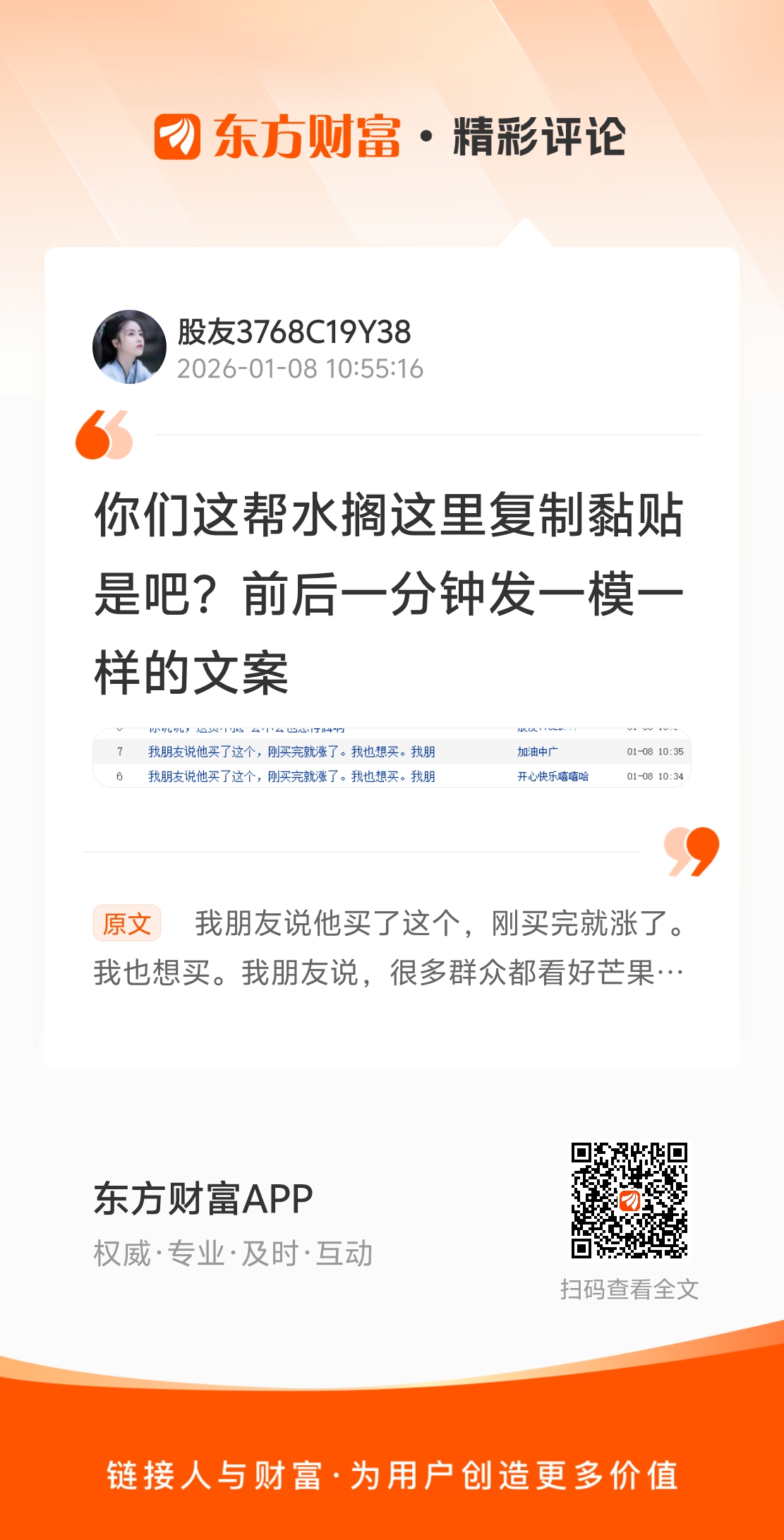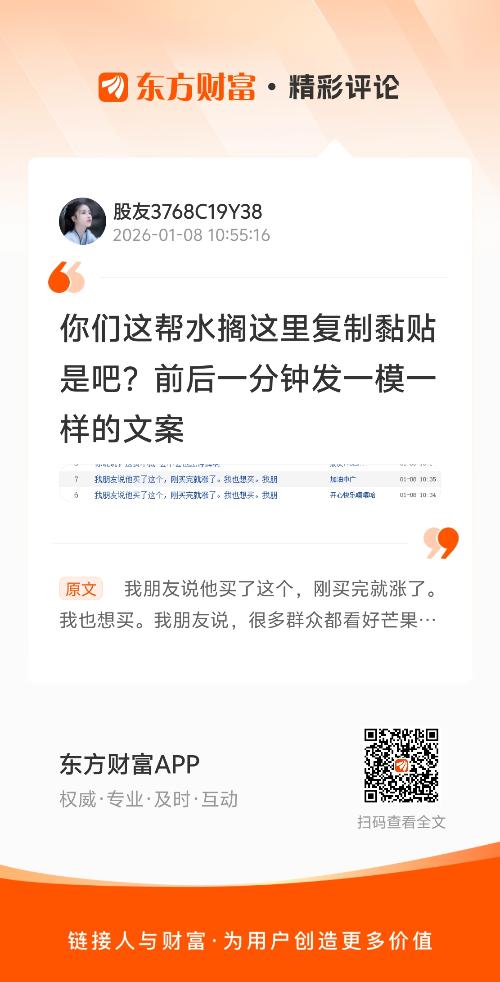 温馨提示: 1.根据《证券法》规定,禁止编造、传播虚假信息或者误导性信息,扰乱证券市场;2.用户在本社区发表的所有资料、言论等仅代表个人观点,与本网站立场无关,不对您构成任何投资建议。用户应基于自己的独立判断,自行决定证券投资并承担相应风险。《东方财富社区管理规定》