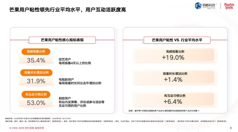芒果TV站内互动活跃用户比例达到53.0%,高于行业均值6.4%。可见芒果TV不仅是一个内容播放平台,更是构建出一个让用户愿意停留、深入观看、乐于互动的强认同社区。
