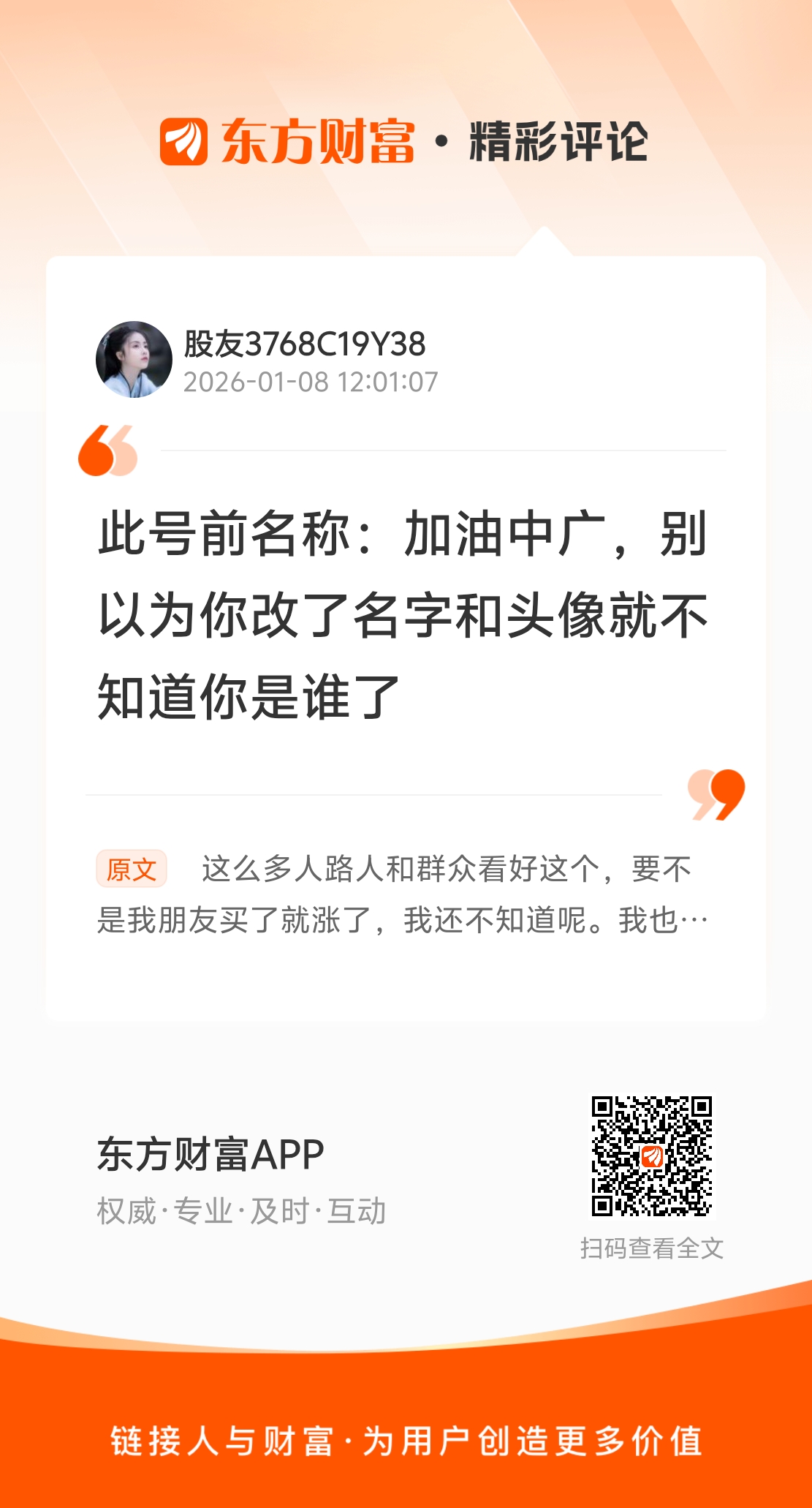 此号前名称:加油中广,别以为你改了名字和头像就不知道你是谁了 我在《这么多人路人和群众看好这个,要不是我朋友买了就涨了,我还不知道呢。我也看好。》的评论获得了大家的关注。