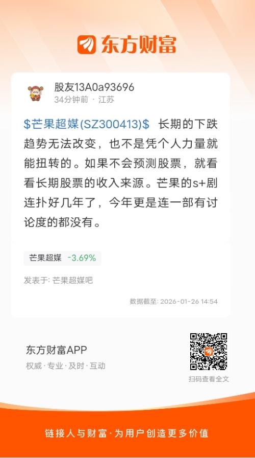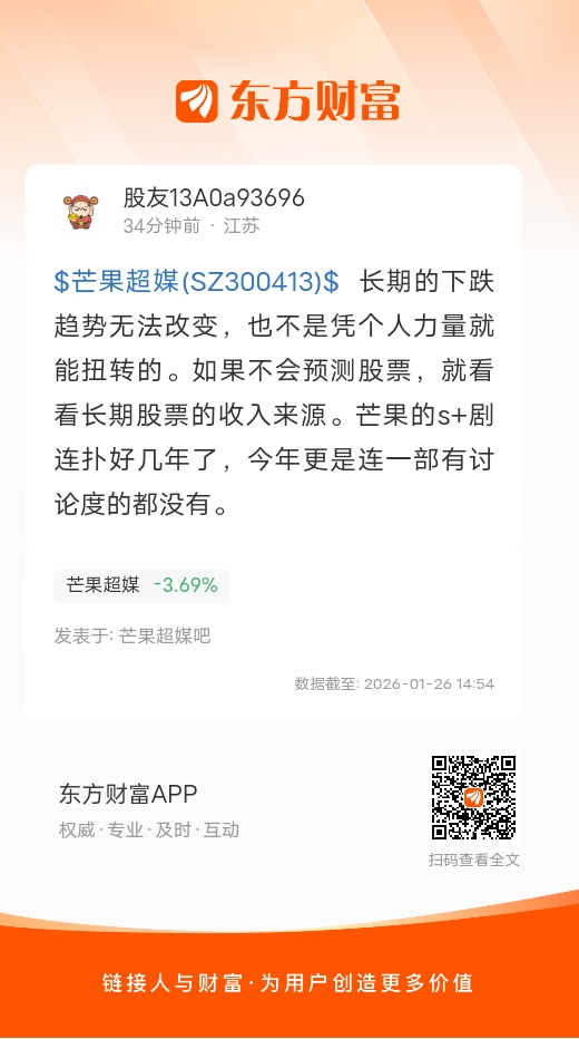 $芒果超媒(SZ300413)$ 长期的下跌趋势无法改变,也不是凭个人力量就能扭转的。如果不会预测股票,就看看长期股票的收入来源。芒果的s+剧连扑好几年了,今年更是连一部有讨论度的都没有。