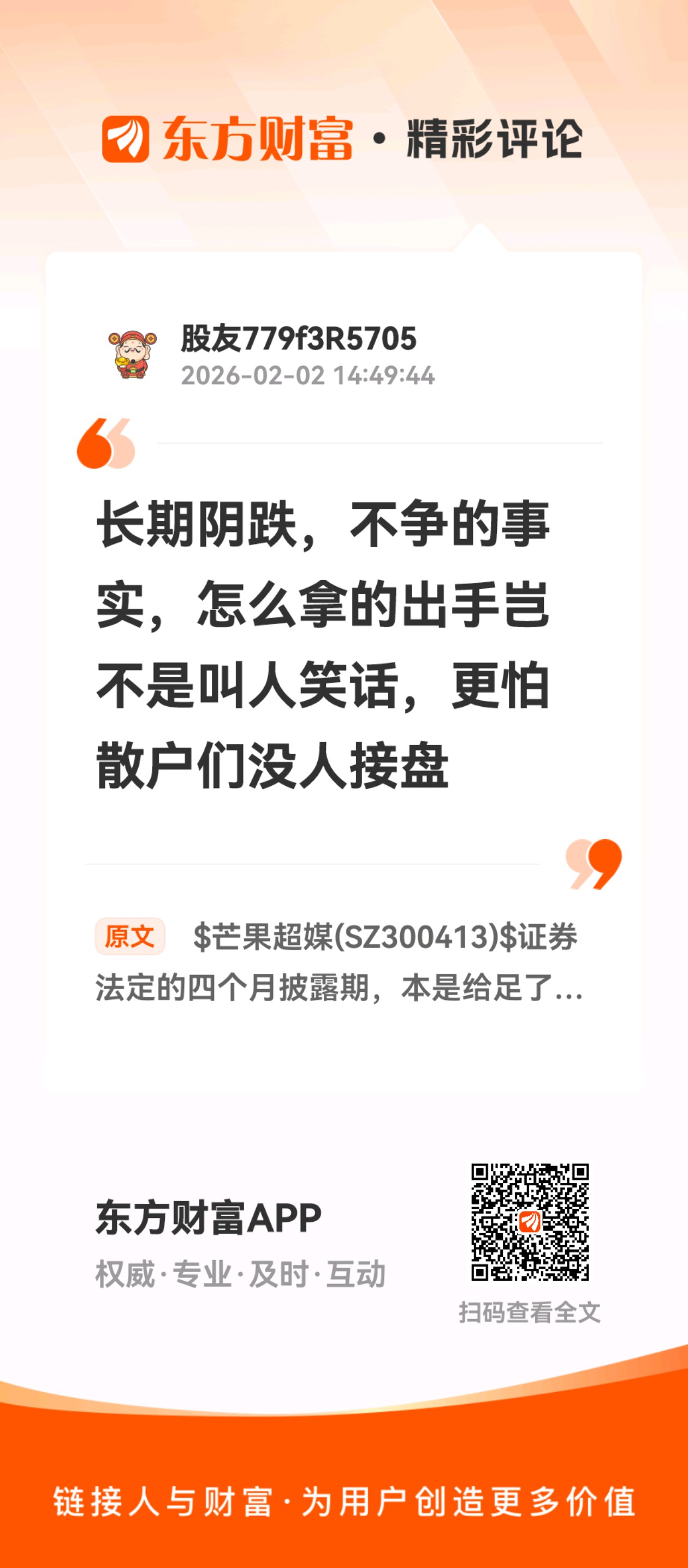 $芒果超媒(SZ300413)$ 证券法定的四个月披露期,本是给足了核算时间,倒成了芒果的“拖延缓冲期”。难不成是财报数据要像做综艺一样反复剪辑,才敢端上资本市场的台面?还是说,非要等到年报季收官前,才肯来一波“压轴出场”的戏码?