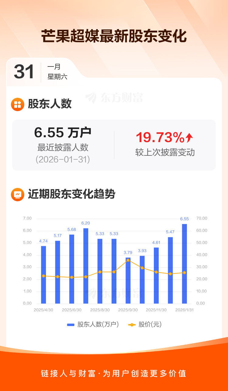 芒果超媒:截至1月31日最新股东户数6.55万户,较上期增加19.73%