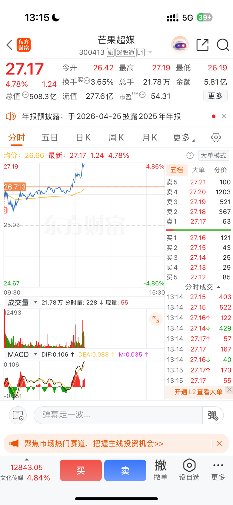 $芒果超媒(SZ300413)$ 开盘哆进去了.