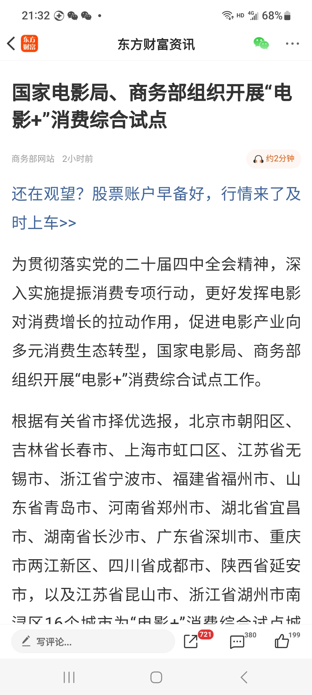 $芒果超媒(SZ300413)$ 国家电影局、商务部组织开展“电影+”消费综合试点。