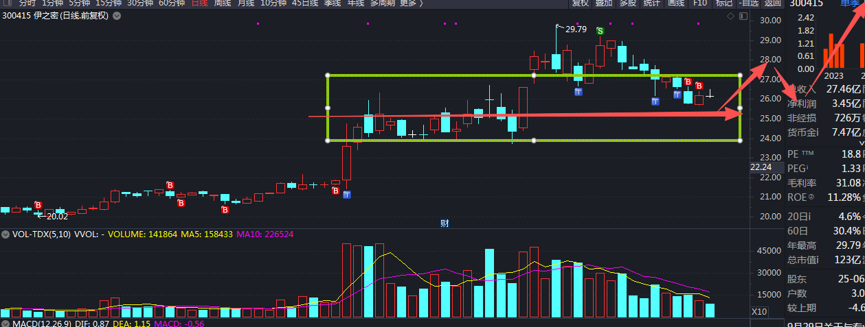 从29.79调整以来,股价进入中短线买入区间。目前26的股价未来半年向下极限2元,向上有10元以上的空间。分批逢跌买入不会有什么大错,别苛求每次都能买在最低点,那是可遇不可求的,像4月9日那次买在最低点纯属偶然。