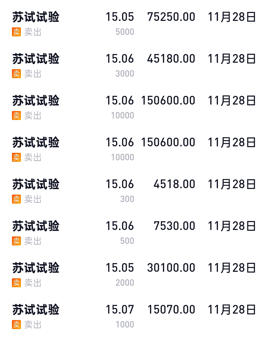 五万股苏试试验,最低成本做到了10块,上周五,全部处理完毕,最新看到9块,12月