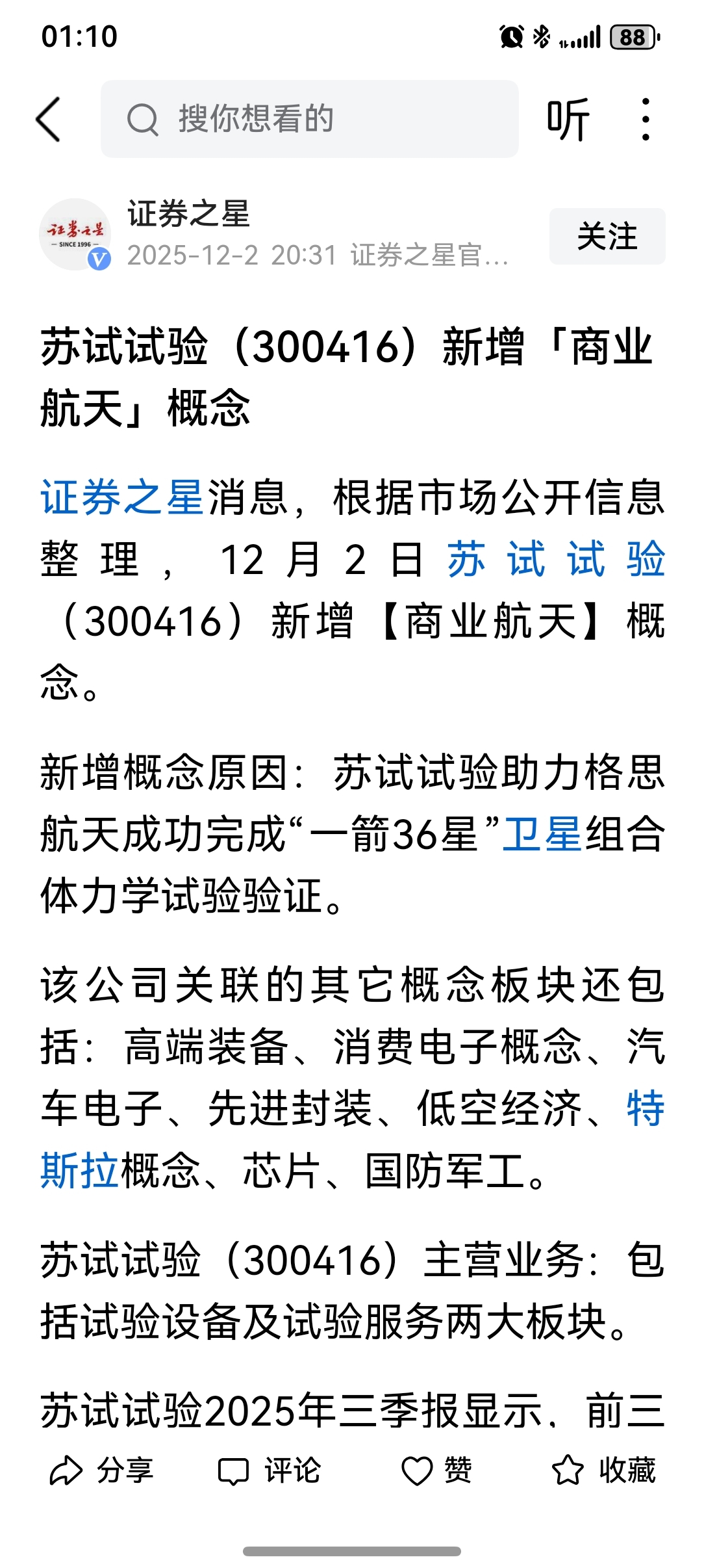 $苏试试验(SZ300416)$ 证券之星消息,苏试试验新增商业航天概念