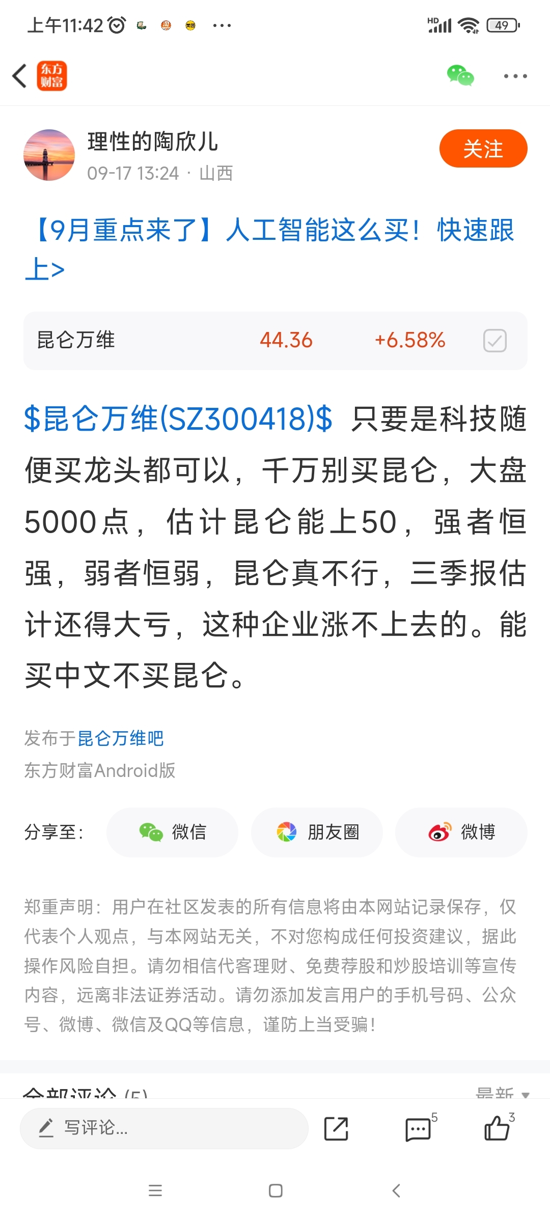 8月7号叫别人低位割昆仑,高位换万兴。隔天万兴就跌了11个点。前天叫人买中文,昨