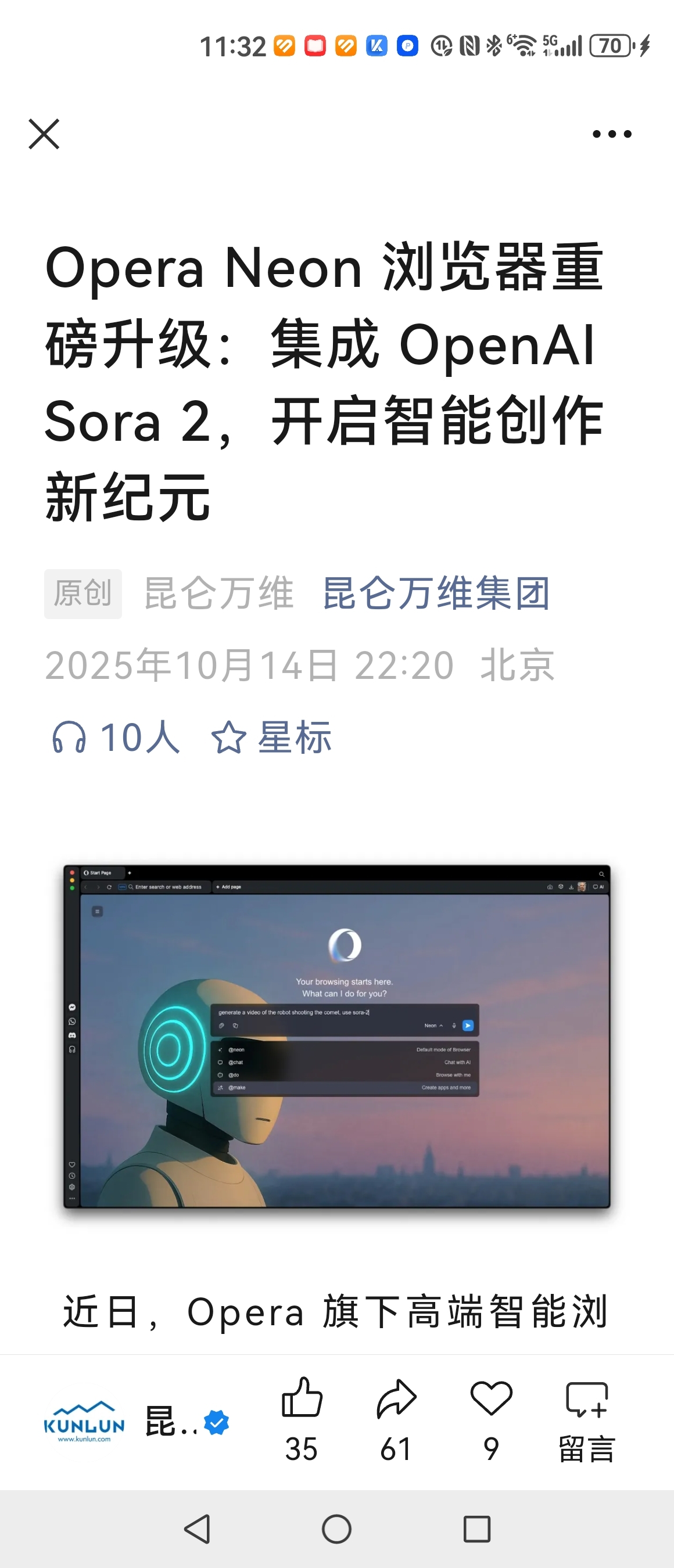 $昆仑万维(SZ300418)$ Opera Neon 浏览器重磅升级:集成 OpenAI Sora 2,开启智能创作新纪元