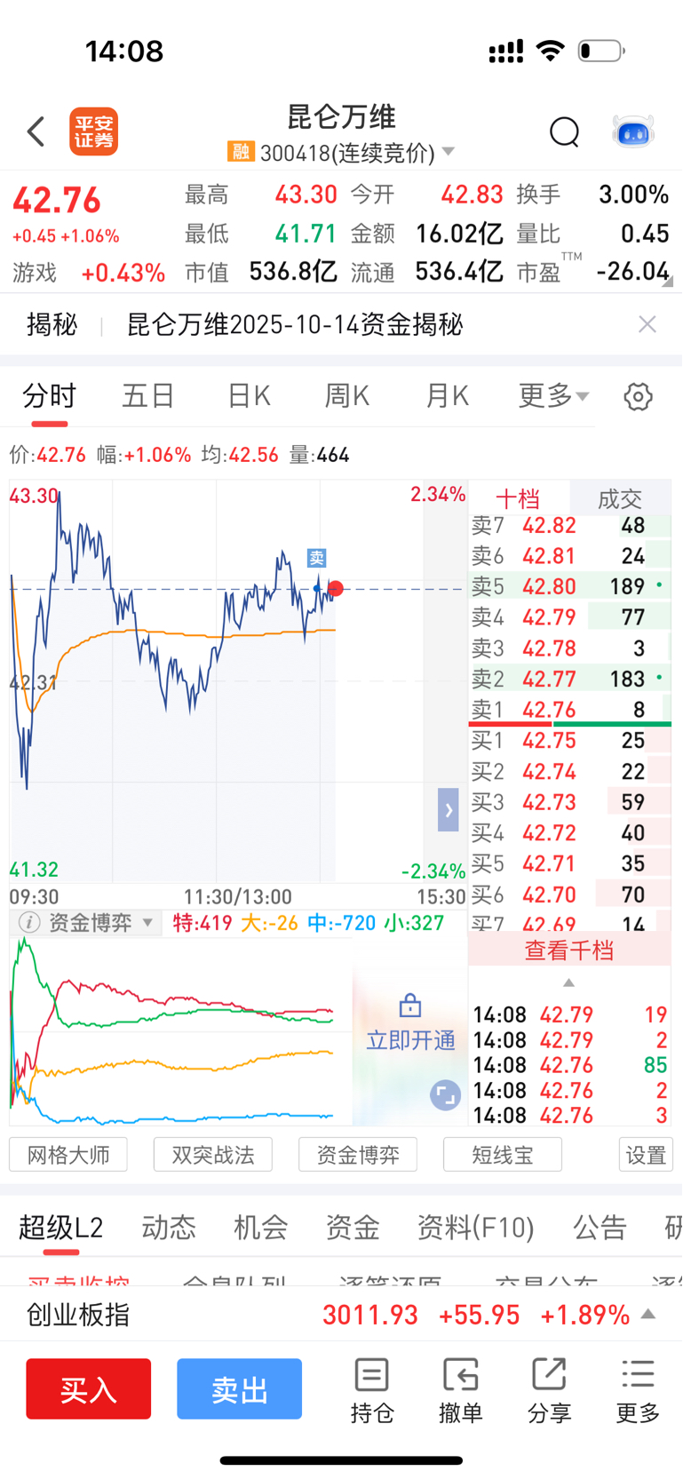 $昆仑万维(SZ300418)$ 昨天42.40买入,今天42.76清仓了,撤了撤了,太弱了,先走了,缩量太严重,并不看好,后面等有机会再进。先去机器人板块玩几周