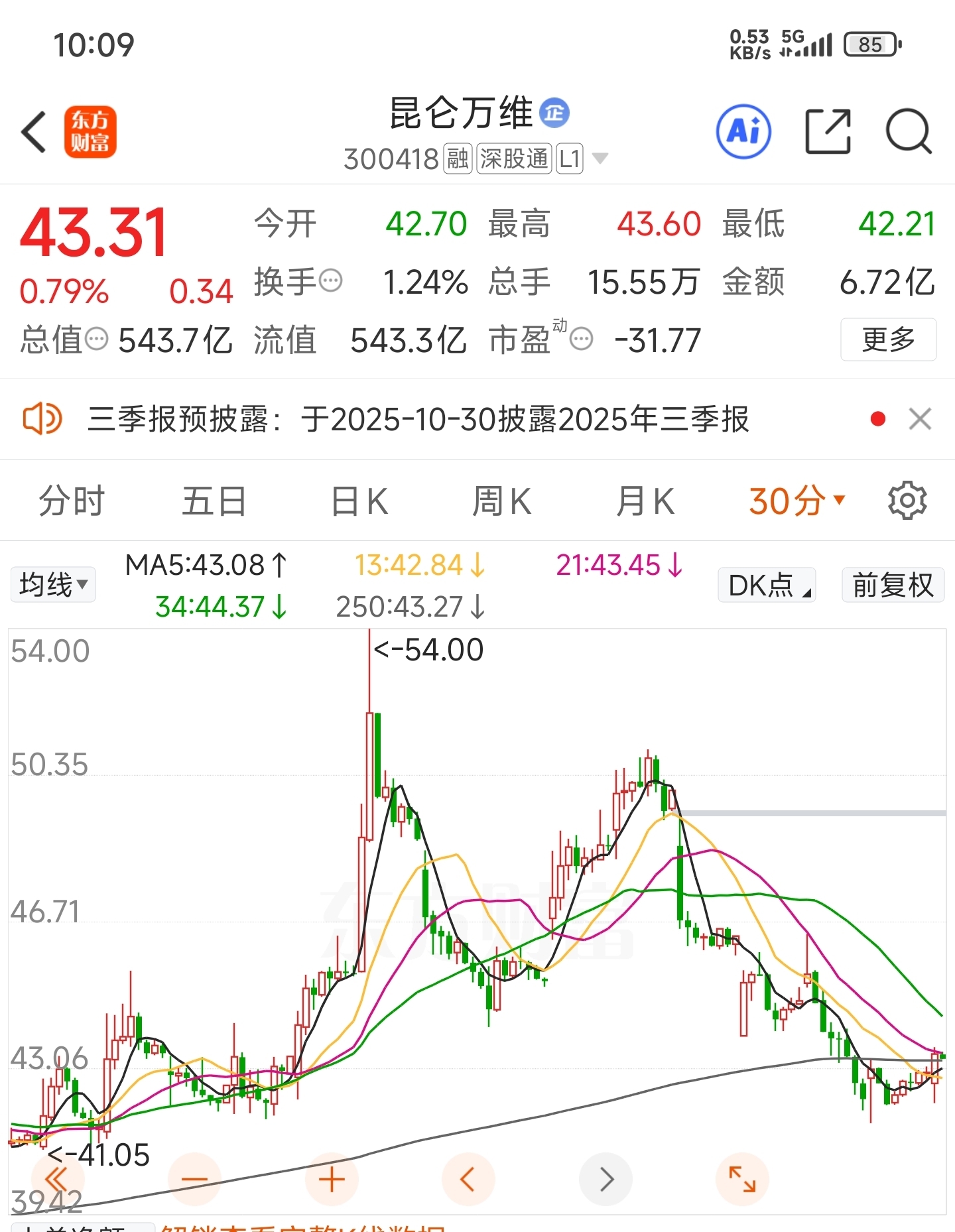 $昆仑万维(SZ300418)$ 今日最高点已现