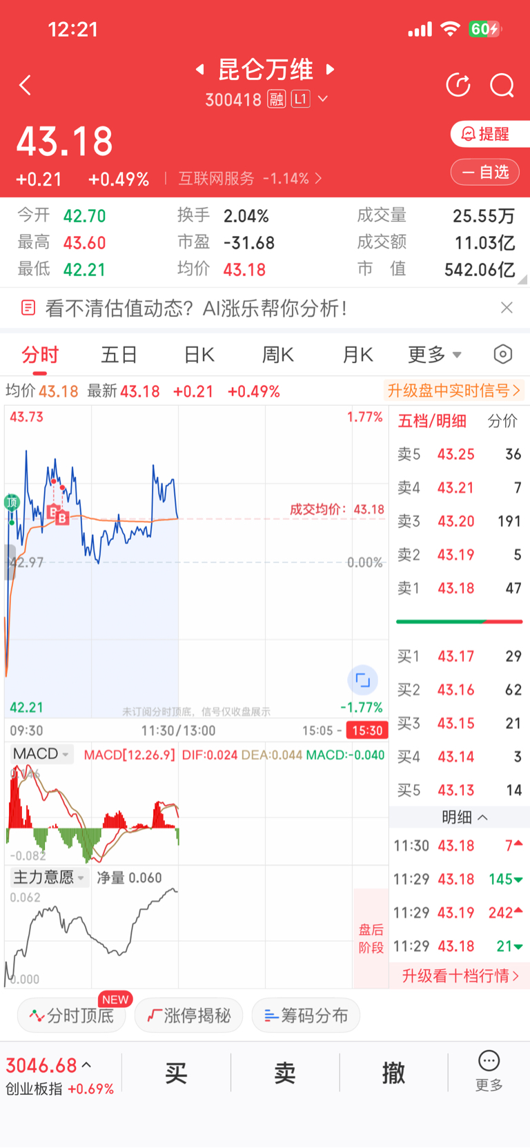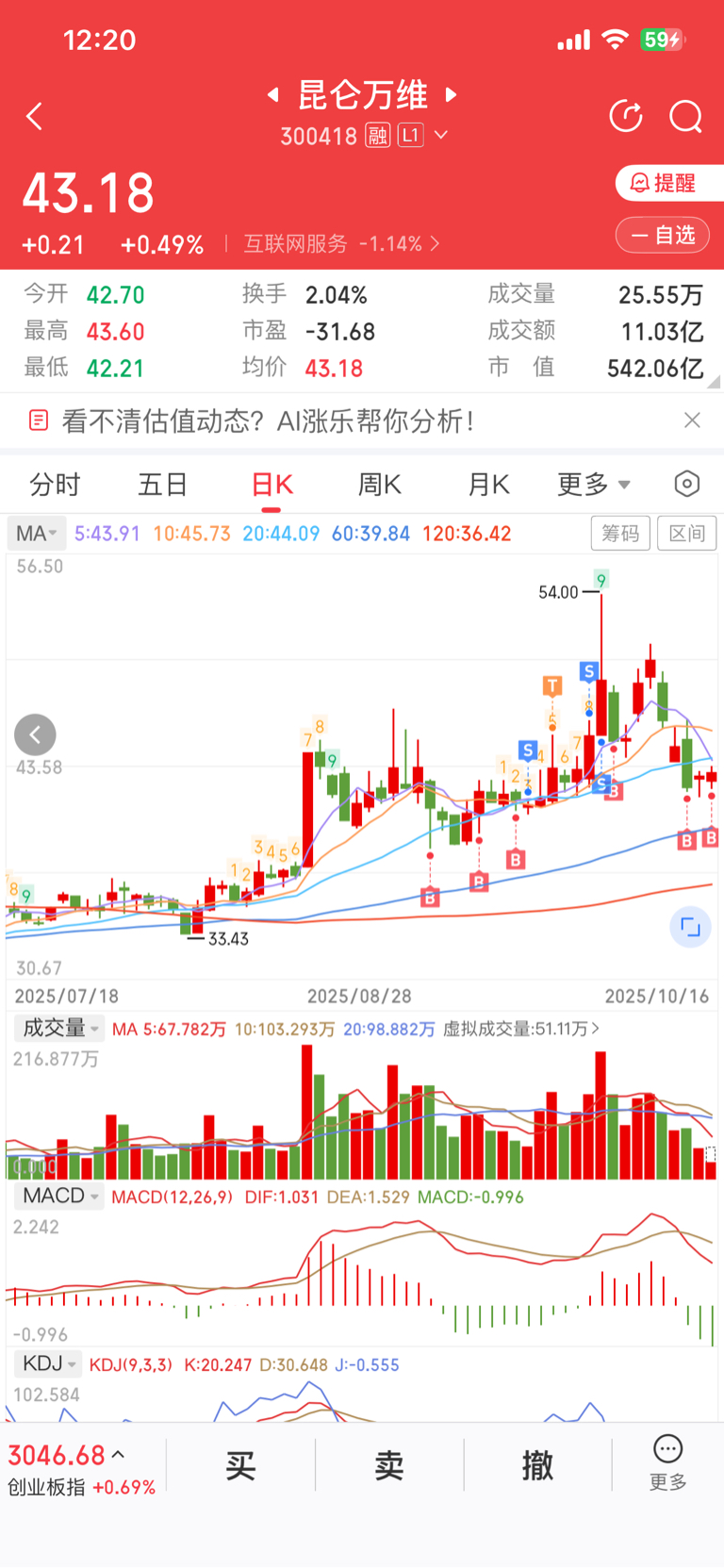 $昆仑万维(SZ300418)$ 46.5开始2次建仓,不断买。本人觉得43左右是最近底部了。全仓一个票梭哈了。一周不看,任它大盘浮沉。