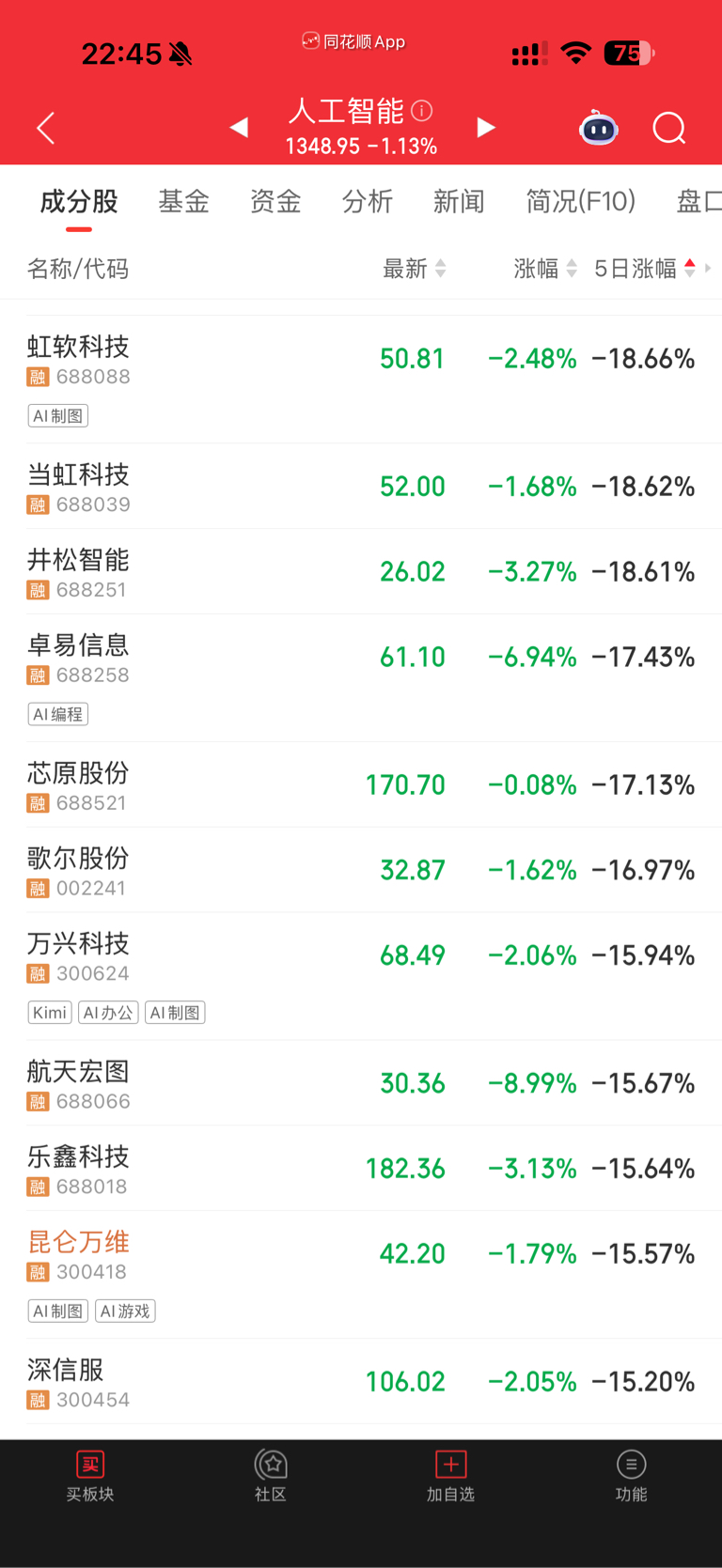 人工智能板块981只股票,你拍倒数13,真是一个213股,买进来亏了一头牛,操