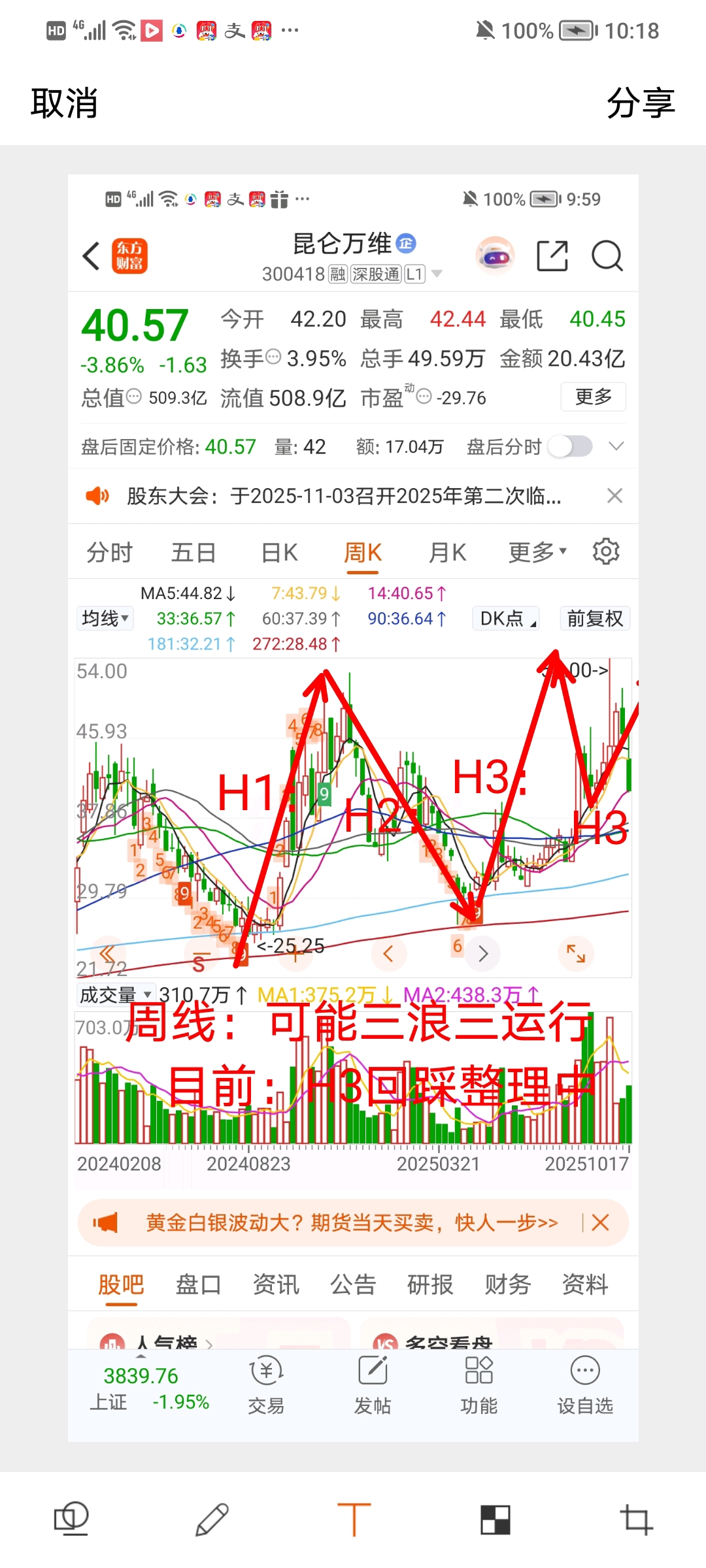 周线级别:波浪运行轨迹:可能走势图解:(目前正处于上升H3整理中)。昆仑万维:周