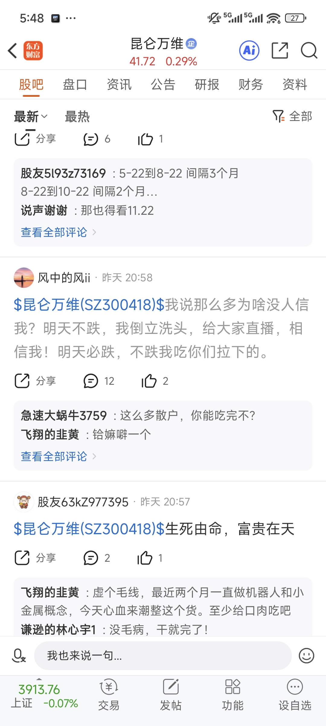 $昆仑万维(SZ300418)$ 昨天有人说不跌,倒立吃……,最讨厌不是发必跌,就是发涨停的