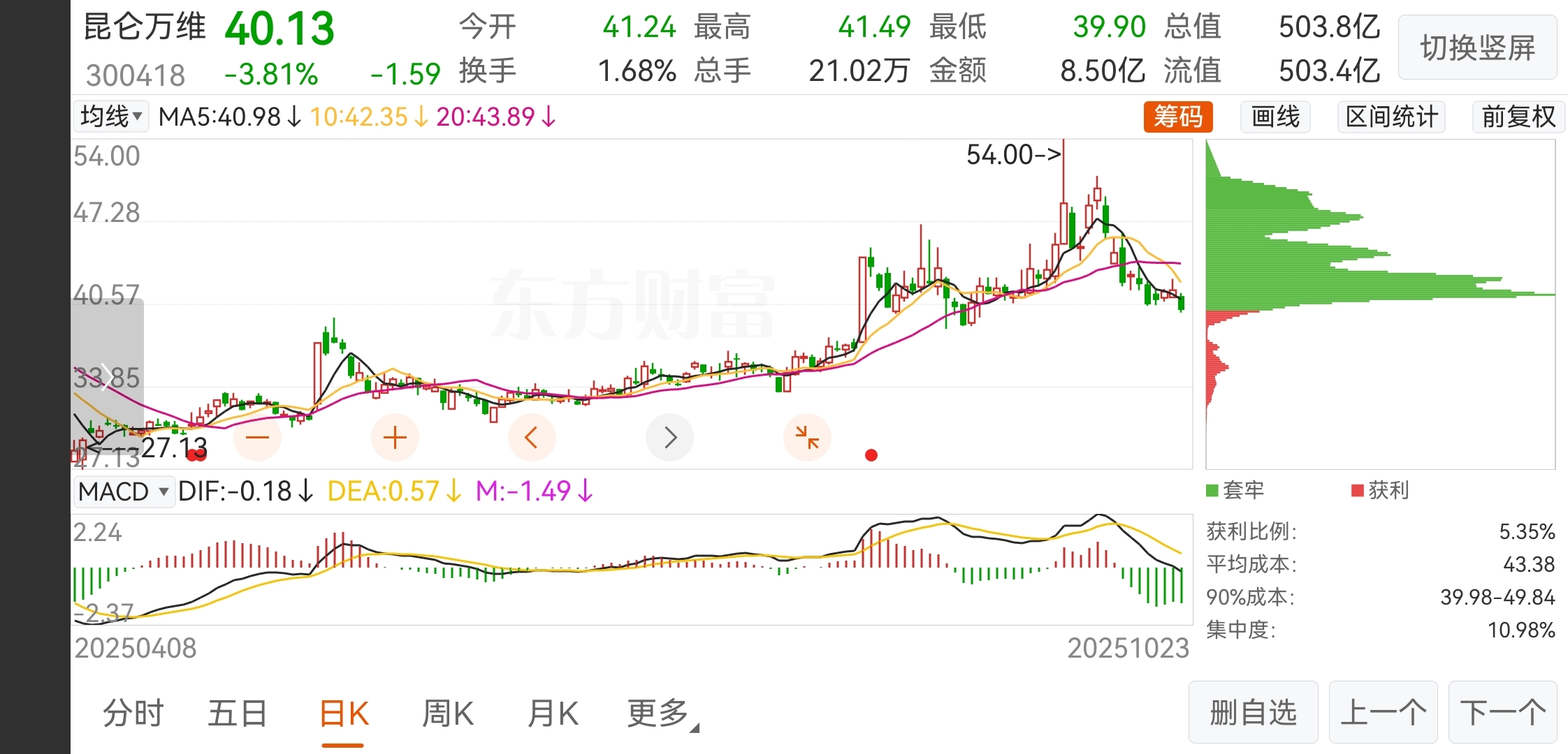 $昆仑万维(SZ300418)$ 46到50之间套了100多个亿,就是不割肉,所以下跌没有底,无尽头
