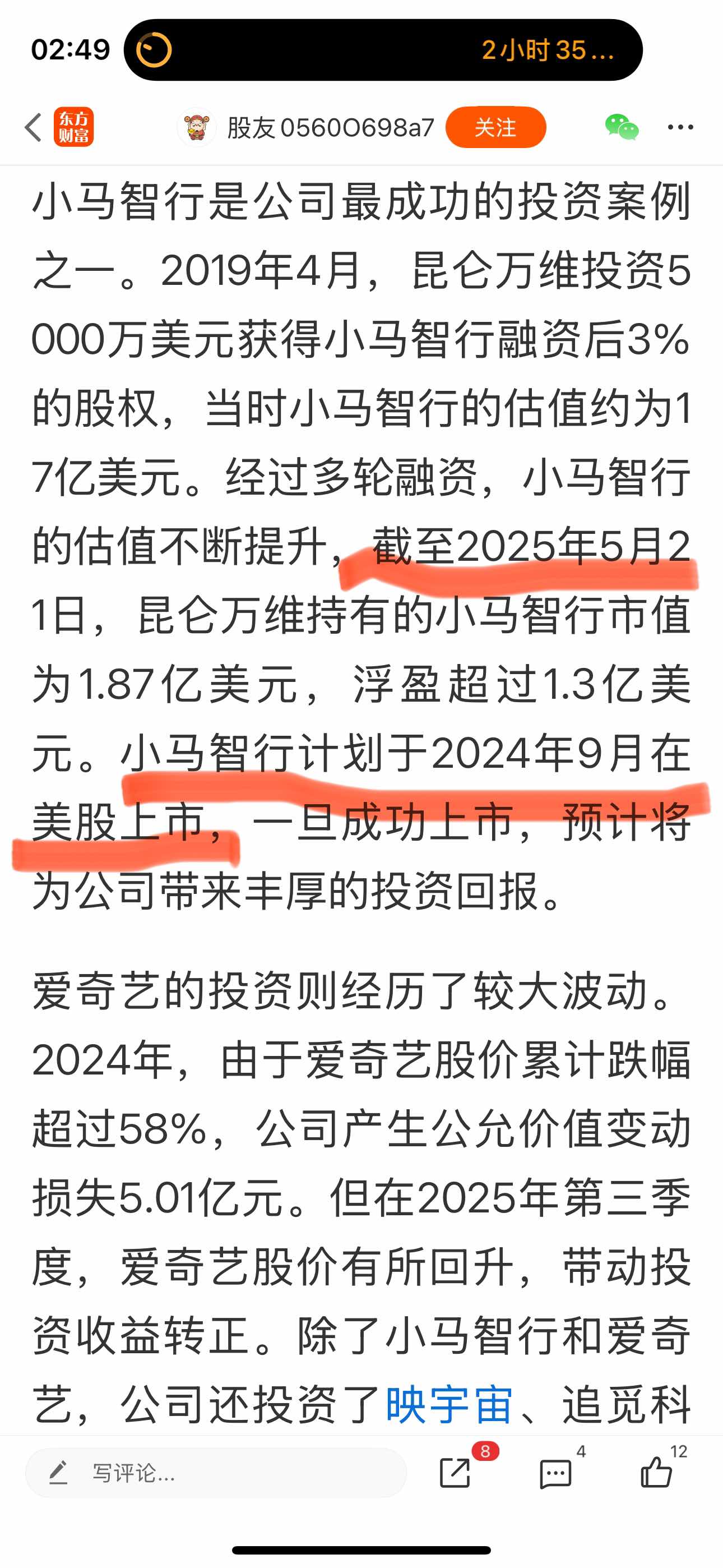 小马智行是公司最成功的投资案例之一。2019年4月,昆仑万维投资5000万美元获得小马智行融资后3%的股权,当时小马智行的估值约为17亿美元。经过多轮融资,小马智行的估值不断提升,截至2025年5月21日,昆仑万维持有的小马智行市值为1.87亿美元,浮盈超过1.3亿美元。小马智行于2024年9月在美股上市,成功上市,预计将为公司带来丰厚的投资回报。