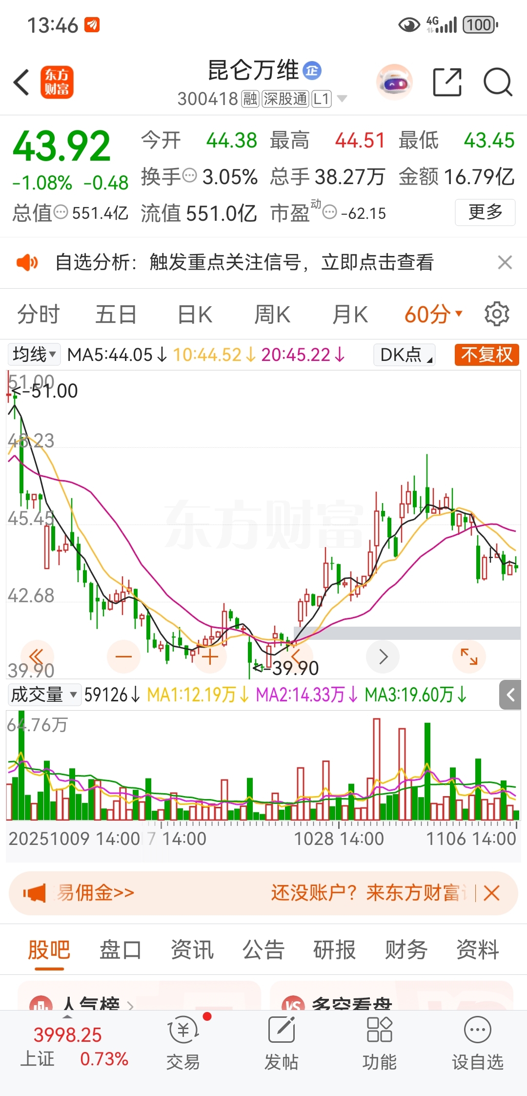$昆仑万维(SZ300418)$ 我再说一遍,41.27这个缺口一定会回补,大盘涨,它都不涨,所以一定会补这个缺口,但凡听人劝的,都会少亏