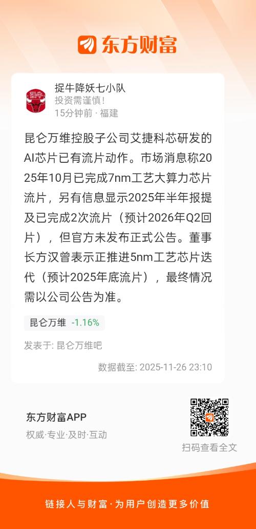 昆仑万维控股子公司艾捷科芯研发的AI芯片已有流片动作。市场消息称2025年10月已完成7nm工艺大算力芯片流片,另有信息显示2025年半年报提及已完成2次流片(预计2026年Q2回片),但官方未发布正式公告。董事长方汉曾表示正推进5nm工艺芯片迭代(预计2025年底流片),最终情况需以公司公告为准。