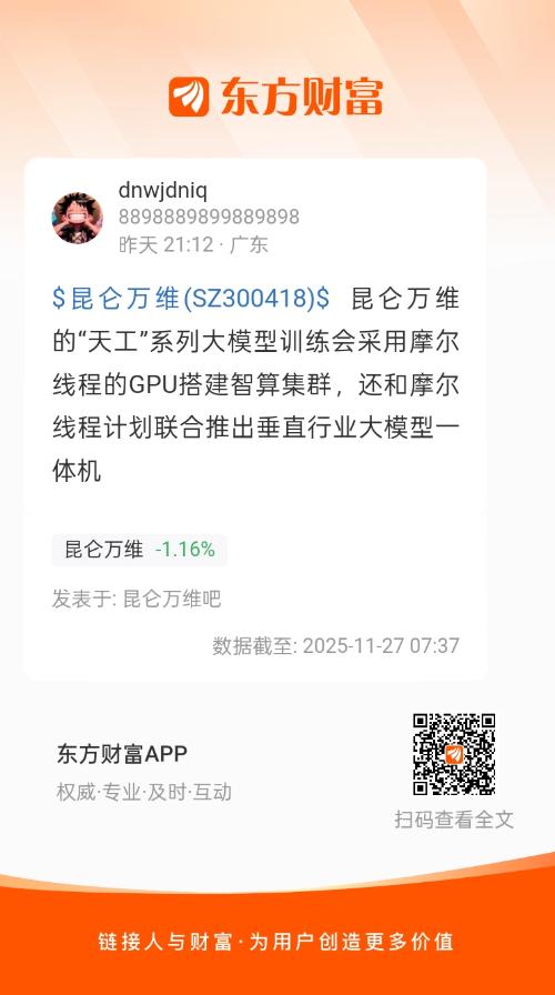$昆仑万维(SZ300418)$ 昆仑万维的“天工”系列大模型训练会采用摩尔线程的GPU搭建智算集群,还和摩尔线程计划联合推出垂直行业大模型一体机