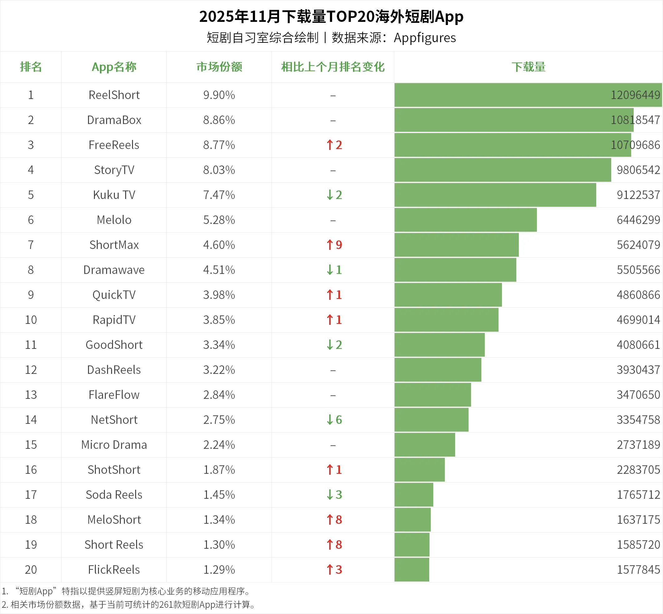 $昆仑万维(SZ300418)$ 昆仑短剧11月继续扩大市场份额,收入拉进与第二名的距离,拉开与第四名的距离。下载量继续高速增长,双平台FreeReels及Dramawave的合计下载量大幅拉开与第二名的距离。昆仑短剧已成头部平台,按照这个发展趋势,规模经济性将初步提升。