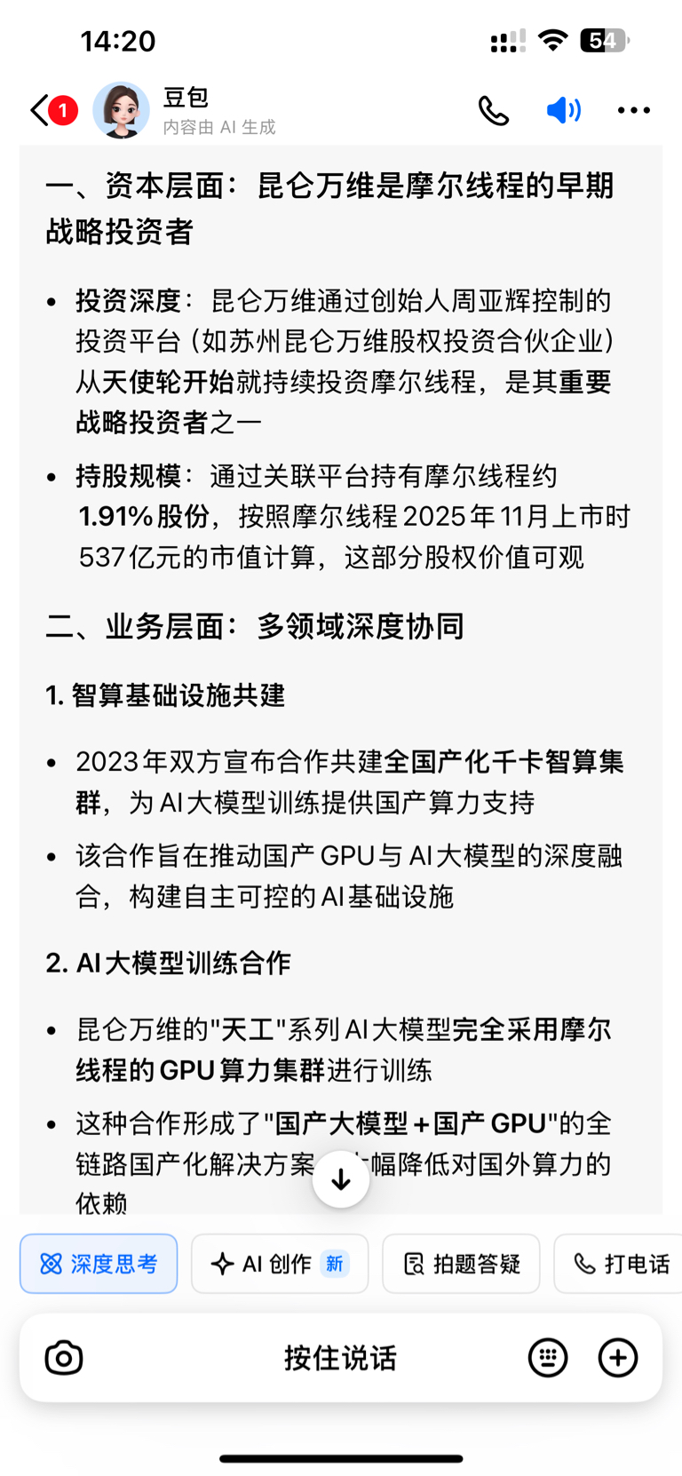 $昆仑万维(SZ300418)$ 摩尔线程,股权+芯片使用绑定