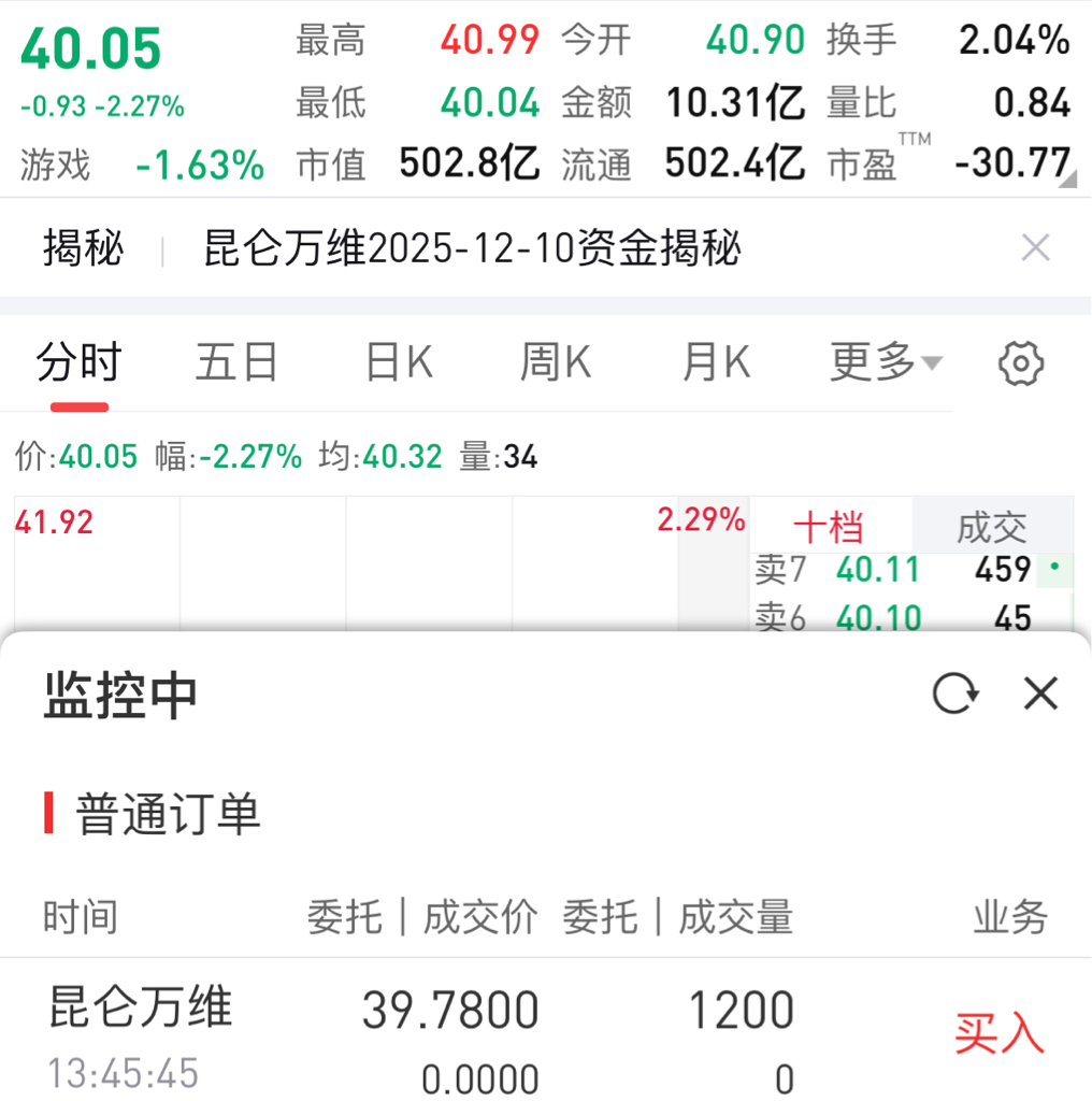 $昆仑万维(SZ300418)$ 委托买入,博个短期反弹