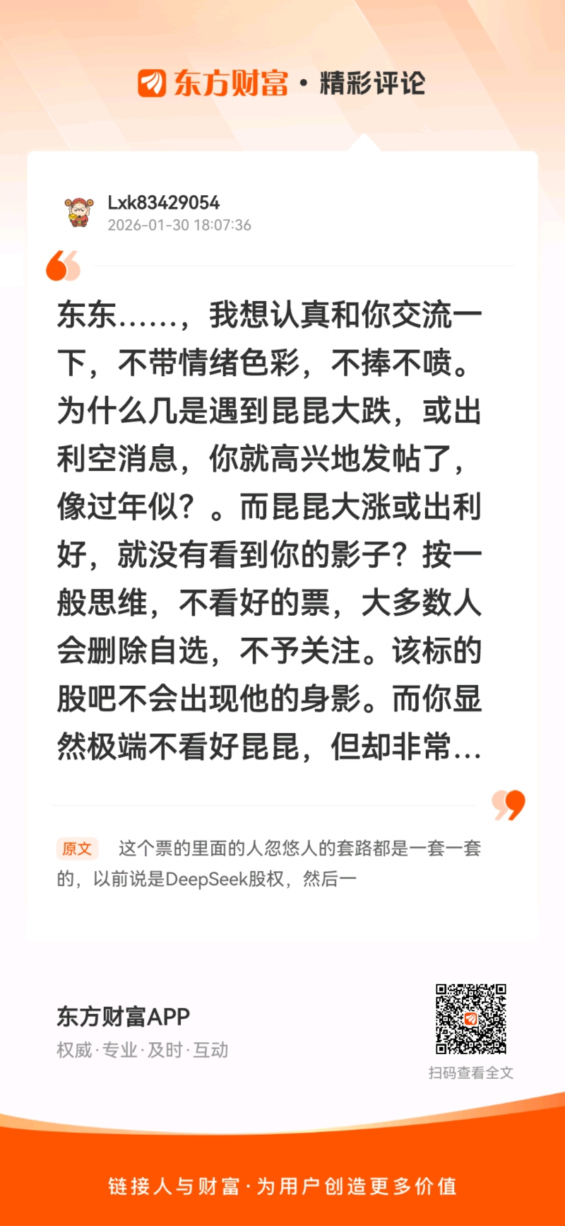 温馨提示: 1.根据《证券法》规定,禁止编造、传播虚假信息或者误导性信息,扰乱证券市场;2.用户在本社区发表的所有资料、言论等仅代表个人观点,与本网站立场无关,不对您构成任何投资建议。用户应基于自己的独立判断,自行决定证券投资并承担相应风险。《东方财富社区管理规定》