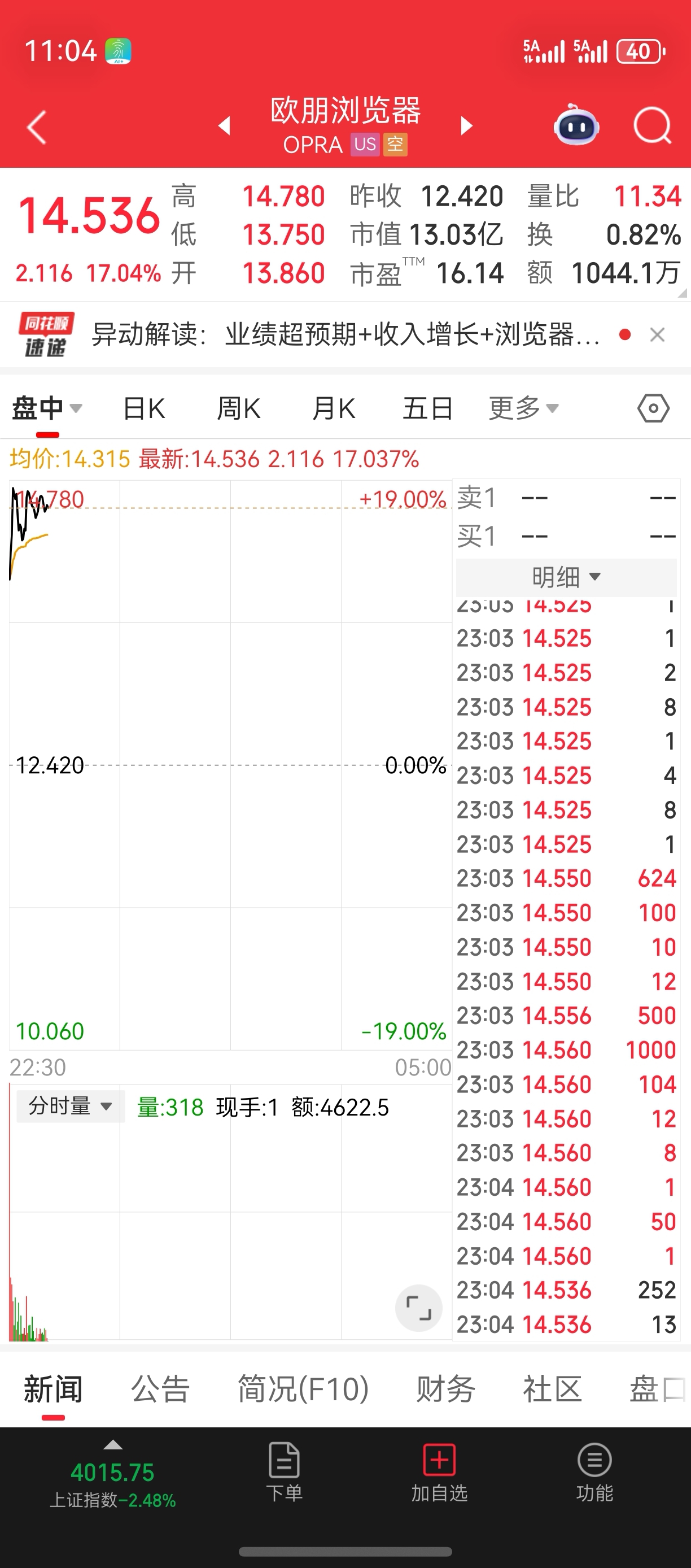 欧朋浏览器美股大涨,明天300418会高开高走