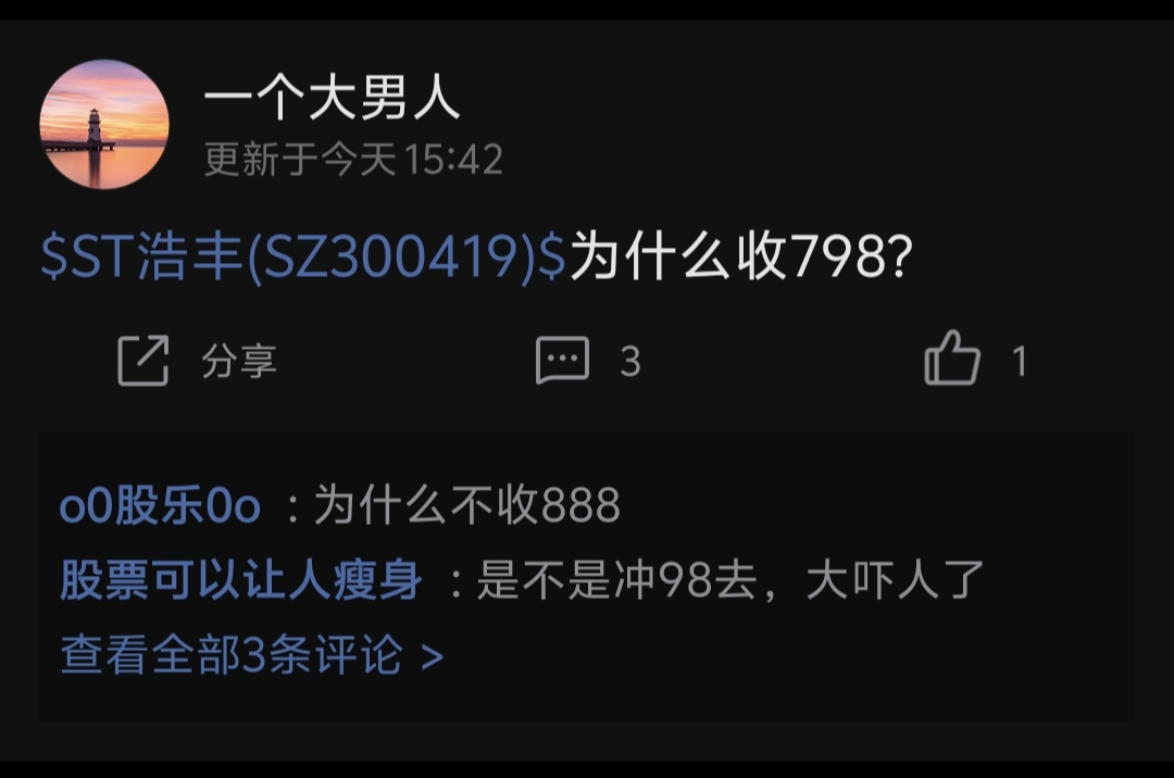 $ST浩丰(SZ300419)$ 吧里有蠢鸡提问:2025.10.31日为啥收7.98元!……这本来是天机不可泄露!……本尊今天破例一次:那是因为下周(也是下月)一要跳空去见9.58(就我发)元!……