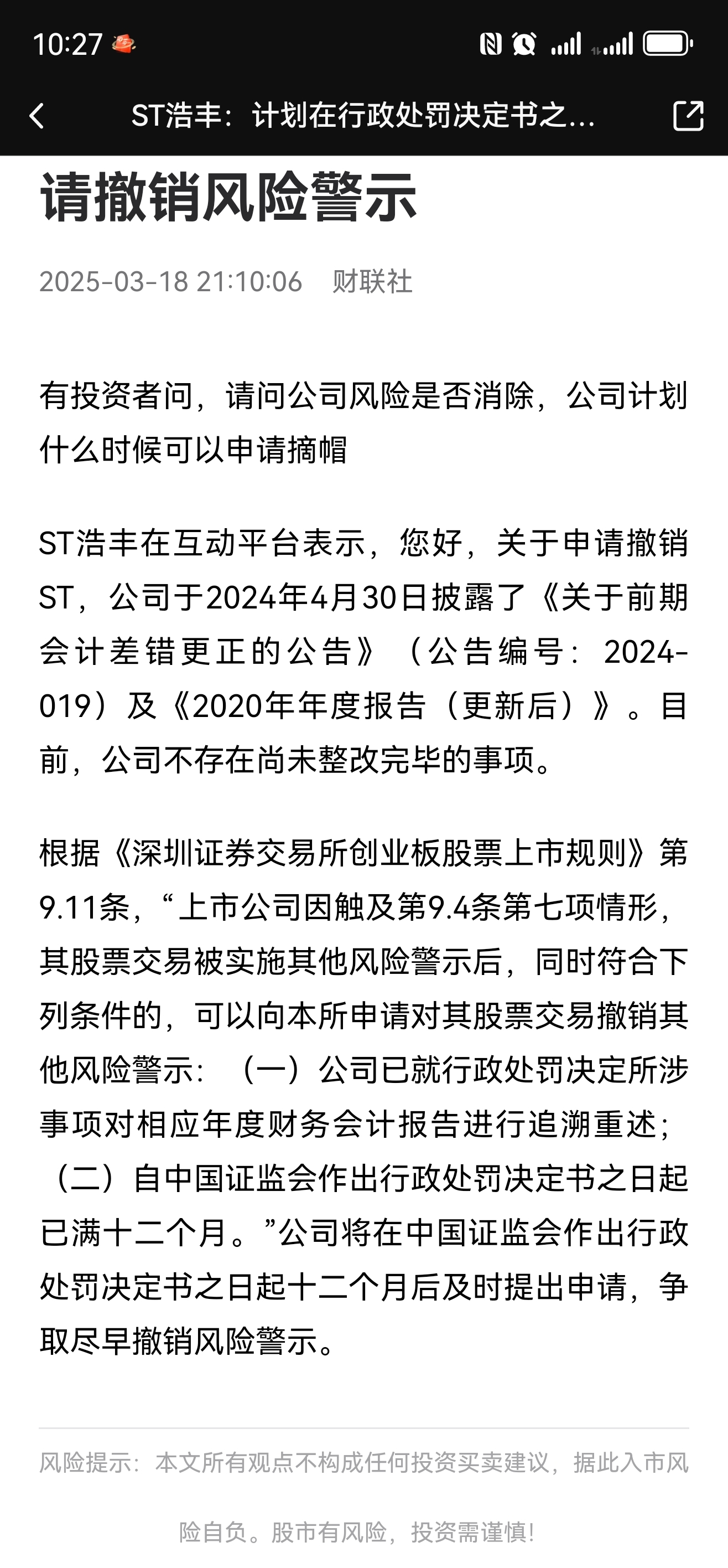 $ST浩丰(SZ300419)$ 都说了可以申请摘帽