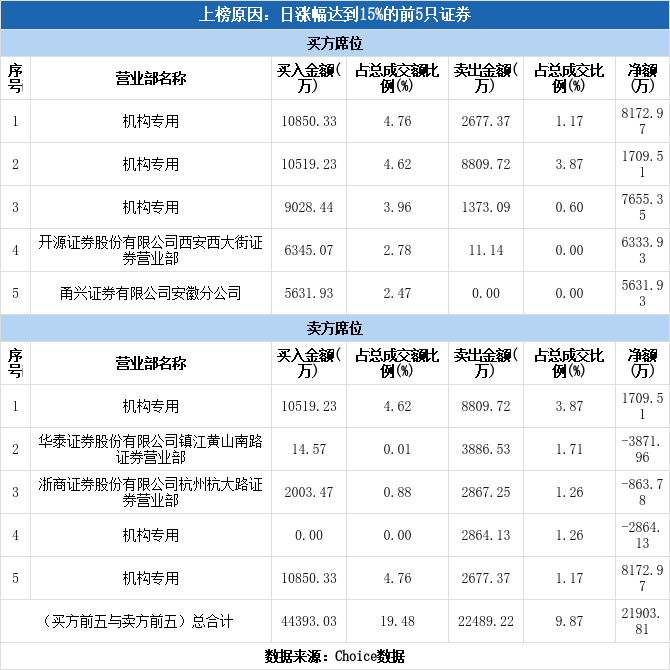 龙虎榜数据显示,今日共6个机构席位出现在龙虎榜单上,分别位列买一、买二、买三、卖一、卖四、卖五,合计净买入1.47亿元,占龙虎榜净买额的66.99%。除此之外还有和而泰、航天发展、晓程科技等37只个股榜单上出现了机构的身影,其中19家呈现机构净买入,获净买入最多的是航天发展,净买额为2.36亿元;18家呈现机构净卖出,其中遭净卖出最高的为和而泰,净卖额为3.08亿元。