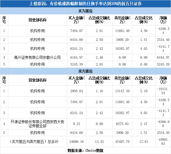 深交所2025年12月8日交易公开信息显示,力星股份因属于有价格涨跌幅限制的日换手率达到30%的前五只证券、有价格涨跌幅限制的连续3个交易日内收盘价格涨幅偏离值累计达到30%的证券而登上龙虎榜。力星股份当日报收32.61元,涨跌幅为13.31%,换手率38.66%,振幅21.96%,成交额25.78亿元。