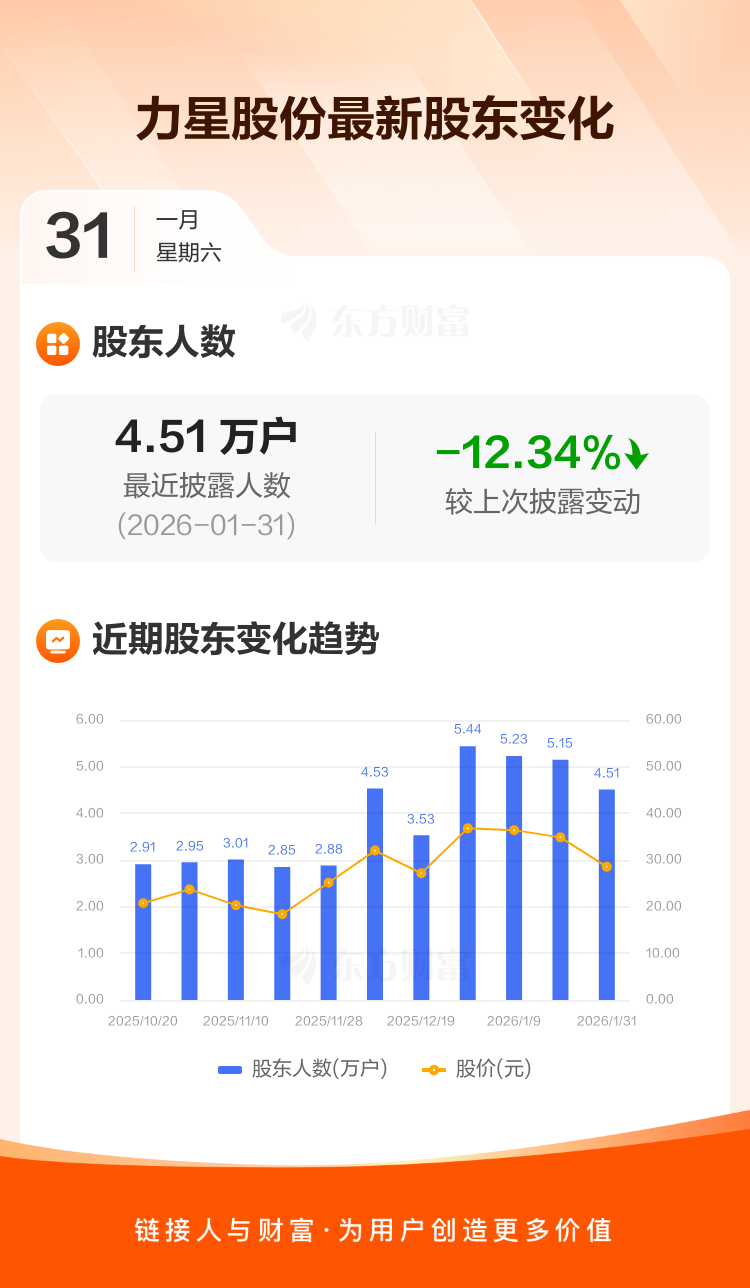 力星股份最新披露数据显示,截至1月31日公司股东户数为4.51万户,较上期(2026年1月20日)减少6352户,降幅为12.34%。户均持有流通股数量由上期的4473股上升至5103股,户均持股金额由上期的15.59万元减少至14.56万元。