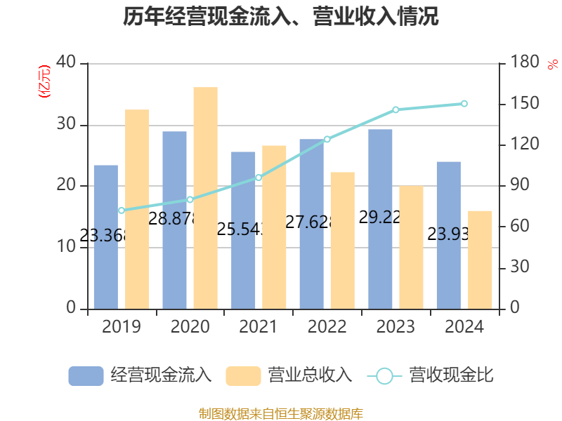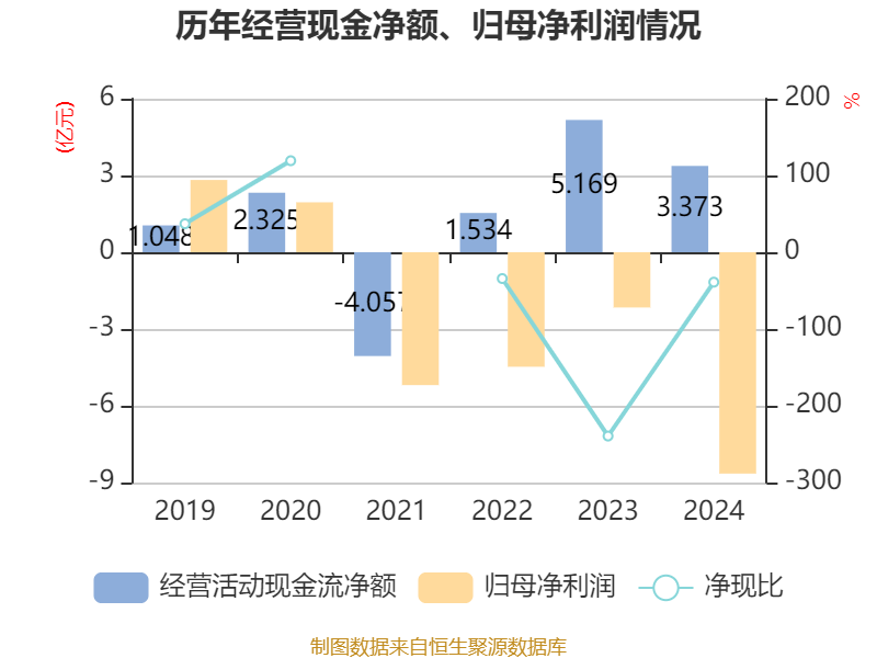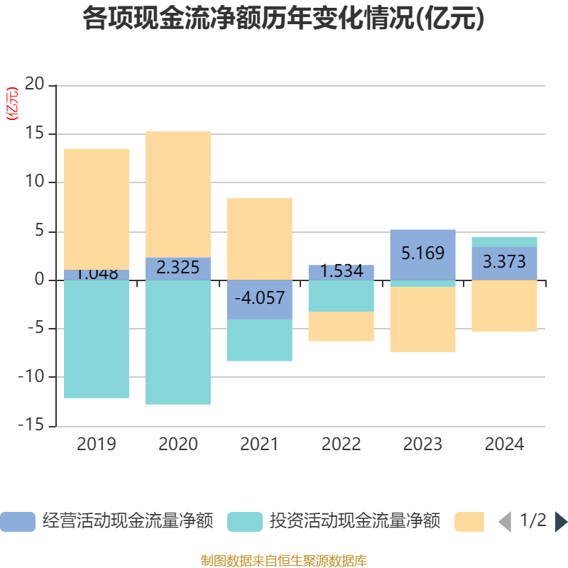 截至2024年,公司经营活动现金流净额为3.37亿元,同比下降34.75%;筹资活动现金流净额-5.3亿元,同比增加1.38亿元;投资活动现金流净额1.04亿元,上年同期为-7198.19万元。