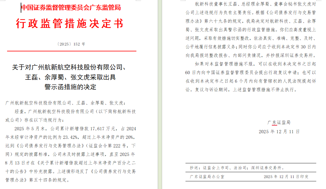 决定书显示,广州航新航空科技股份有限公司存在以下违规行为:2025年5月末,公司累计新增借款17,617万元,占2024年末经审计净资产的比例为23.42%,超过上年末净资产的20%,达到《公司债券发行与交易管理办法》规定的披露标准,公司未及时披露上述事项,直至2025年8月13日才在《关于累计新增借款超过上年末净资产百分之二十的公告》中补充披露。