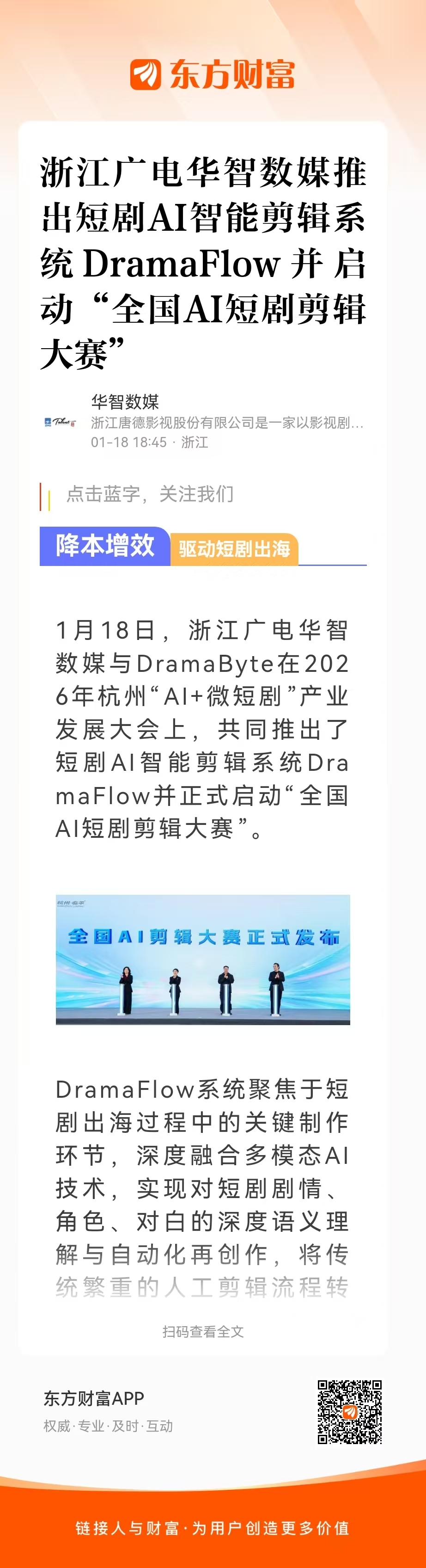$华智数媒(SZ300426)$ 华智数媒推出短剧AI智能剪辑系统DramaFlow
