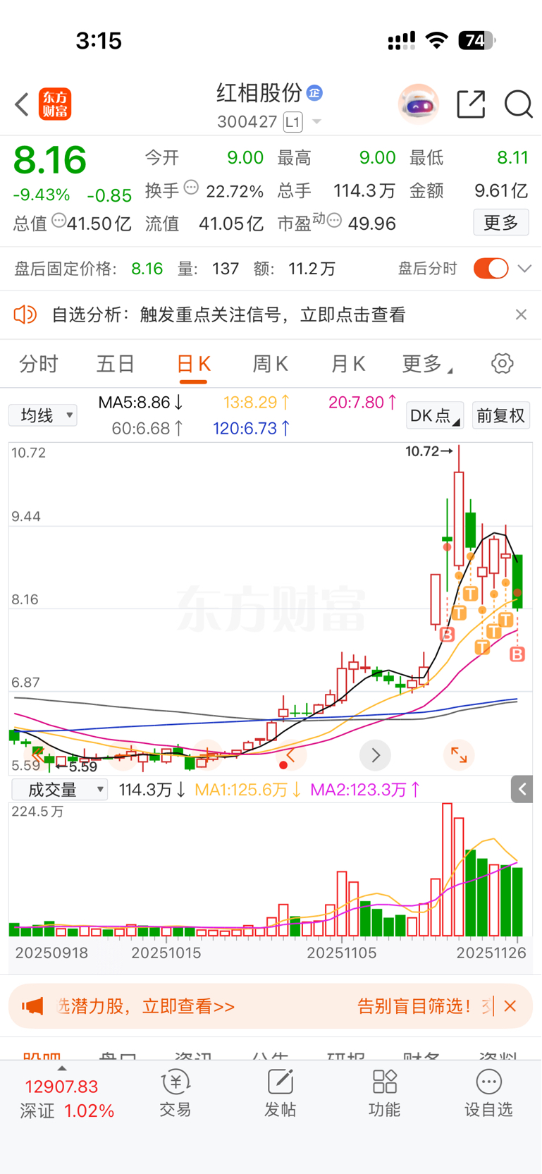 $红相股份(SZ300427)$ 这算不算断头铡,差点没干破20日,捏一个桔的猪力,劳资几天时间盈利全给你了,跟你干上了