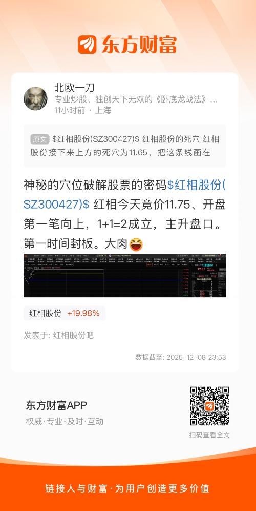 神秘的穴位破解股票的密码$红相股份(SZ300427)$ 红相今天竞价11.75、开盘第一笔向上,1+1=2成立,主升盘口。第一时间封板。大肉