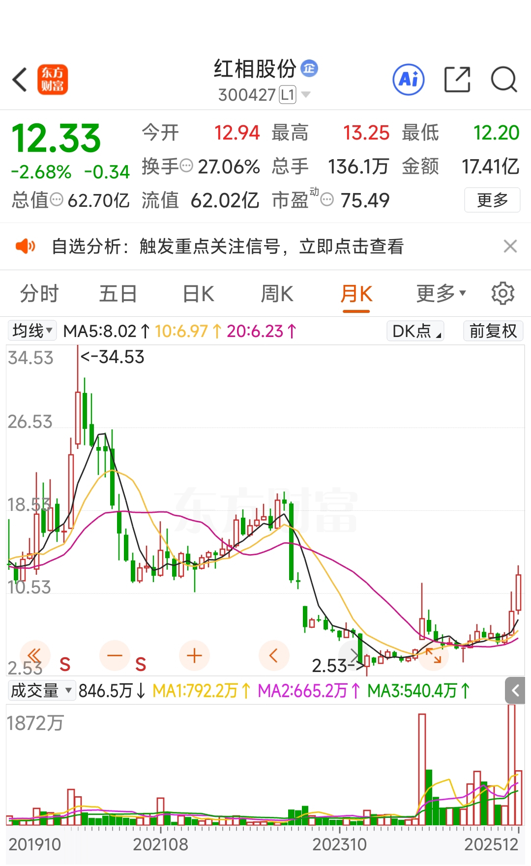 福建+军工+商业航天+雷达+芯片+电力+龙虎榜机构,从34元跌到2.53元,月线