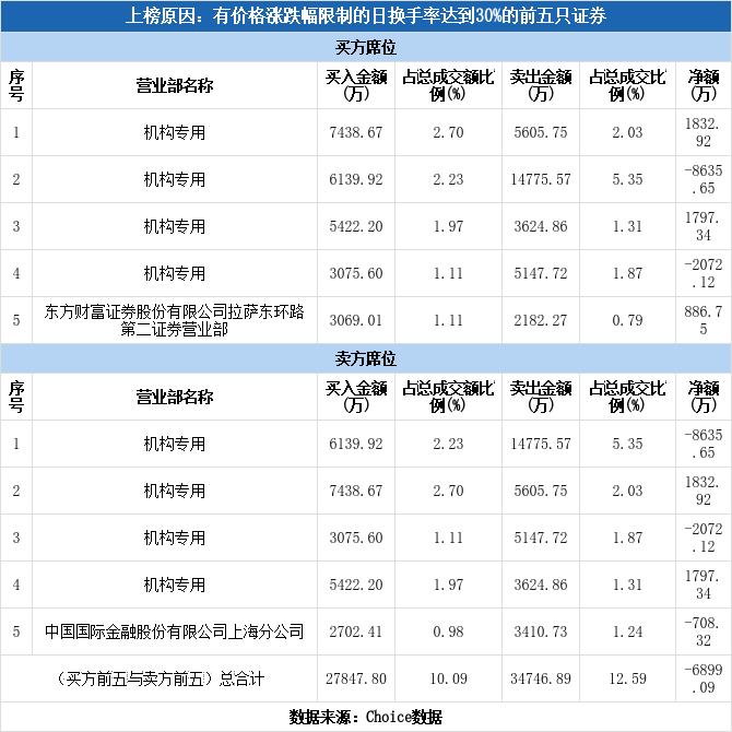 龙虎榜数据显示,今日共8个机构席位出现在龙虎榜单上,分别位列买一、买二、买三、买四、卖一、卖二、卖三、卖四,合计净卖出7077.51万元,占龙虎榜净卖额的102.59%。除此之外还有中兴通讯、永辉超市、正邦科技等34只个股榜单上出现了机构的身影,其中15家呈现机构净买入,获净买入最多的是中兴通讯,净买额为6.32亿元;19家呈现机构净卖出,其中遭净卖出最高的为永辉超市,净卖额为3.95亿元。