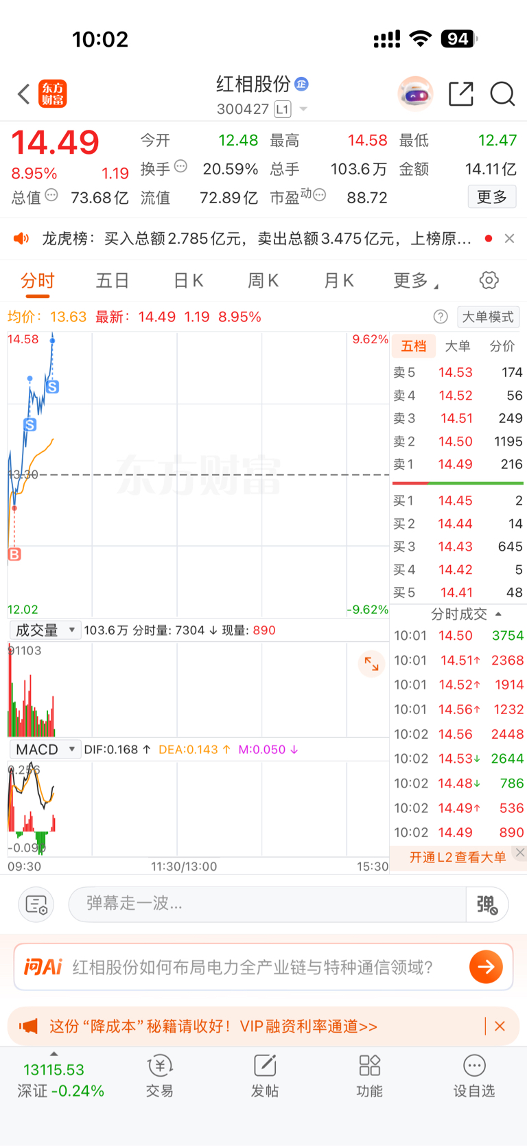 $红相股份(SZ300427)$ 又是香槟的一天,可惜开盘买不到,知足