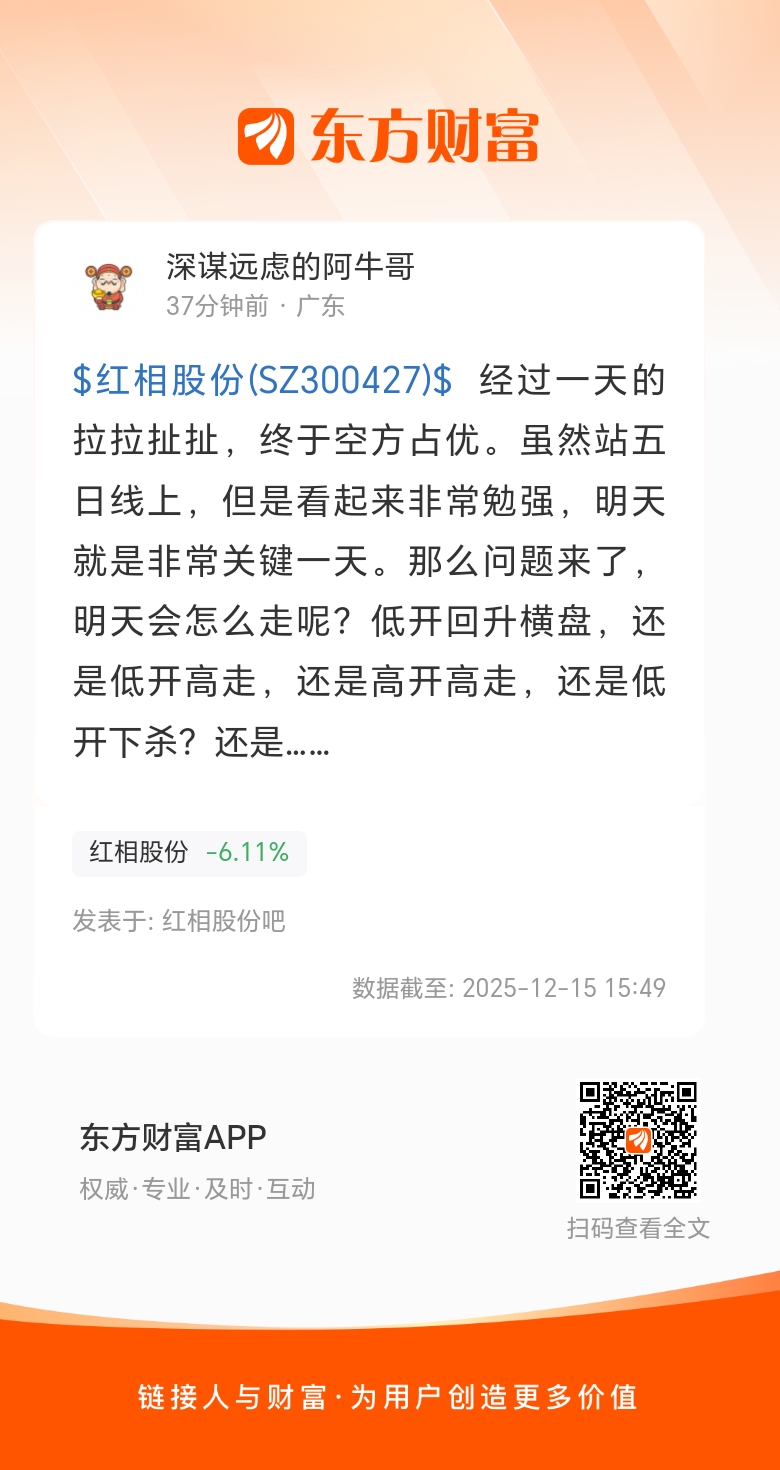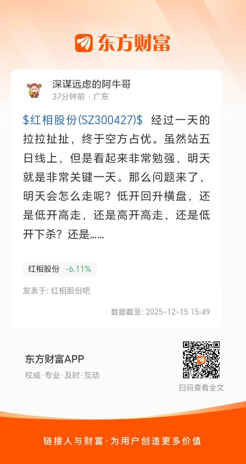 $红相股份(SZ300427)$ 经过一天的拉拉扯扯,终于空方占优。虽然站五日线上,但是看起来非常勉强,明天就是非常关键一天。那么问题来了,明天会怎么走呢?低开回升横盘,还是低开高走,还是高开高走,还是低开下杀?还是……