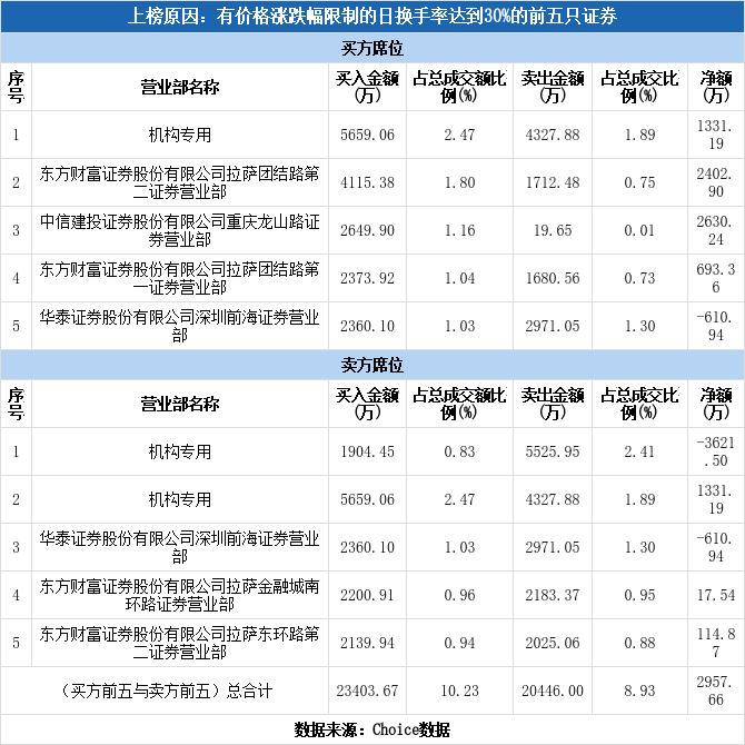 龙虎榜数据显示,今日共3个机构席位出现在龙虎榜单上,分别位列买一、卖一、卖二,合计净卖出2290.31万元,占该股今日总成交额的1%。除此之外还有航天电子、ST嘉澳、中超控股等36只个股榜单上出现了机构的身影,其中20家呈现机构净买入,获净买入最多的是中超控股,净买额为1.24亿元;16家呈现机构净卖出,其中遭净卖出最高的为航天电子,净卖额为3.37亿元。