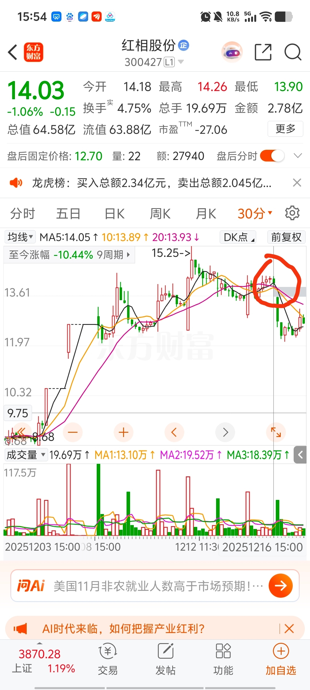 昨天回落到30分钟级别的20ma已经离危险很近了,今天又跳空低开破了趋势线,红色
