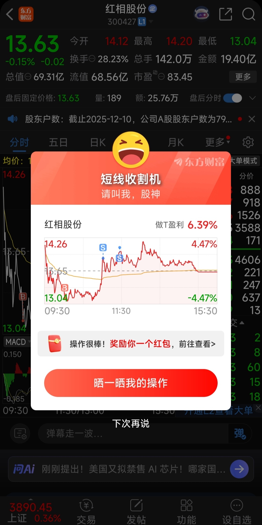 不要被红香杀跌的现象而吓住,当日T+0这支红香是最好标的,几乎下午都会拉升一波,今天的操作还算满意,下周继续,明年3/4月份本人坚定看好红香能到25元。(个人之见,不构成投资建议)