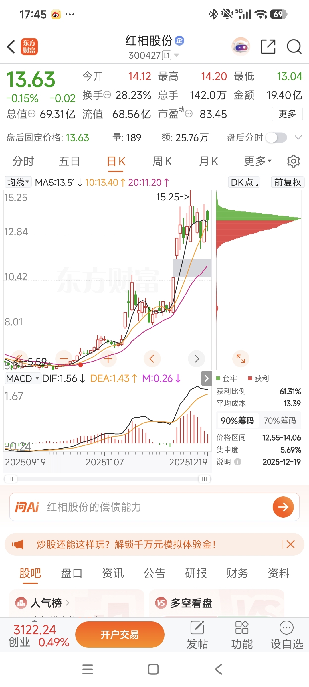 $红相股份(SZ300427)$ 筹码峰高度集中#强势机会# 周一涨停